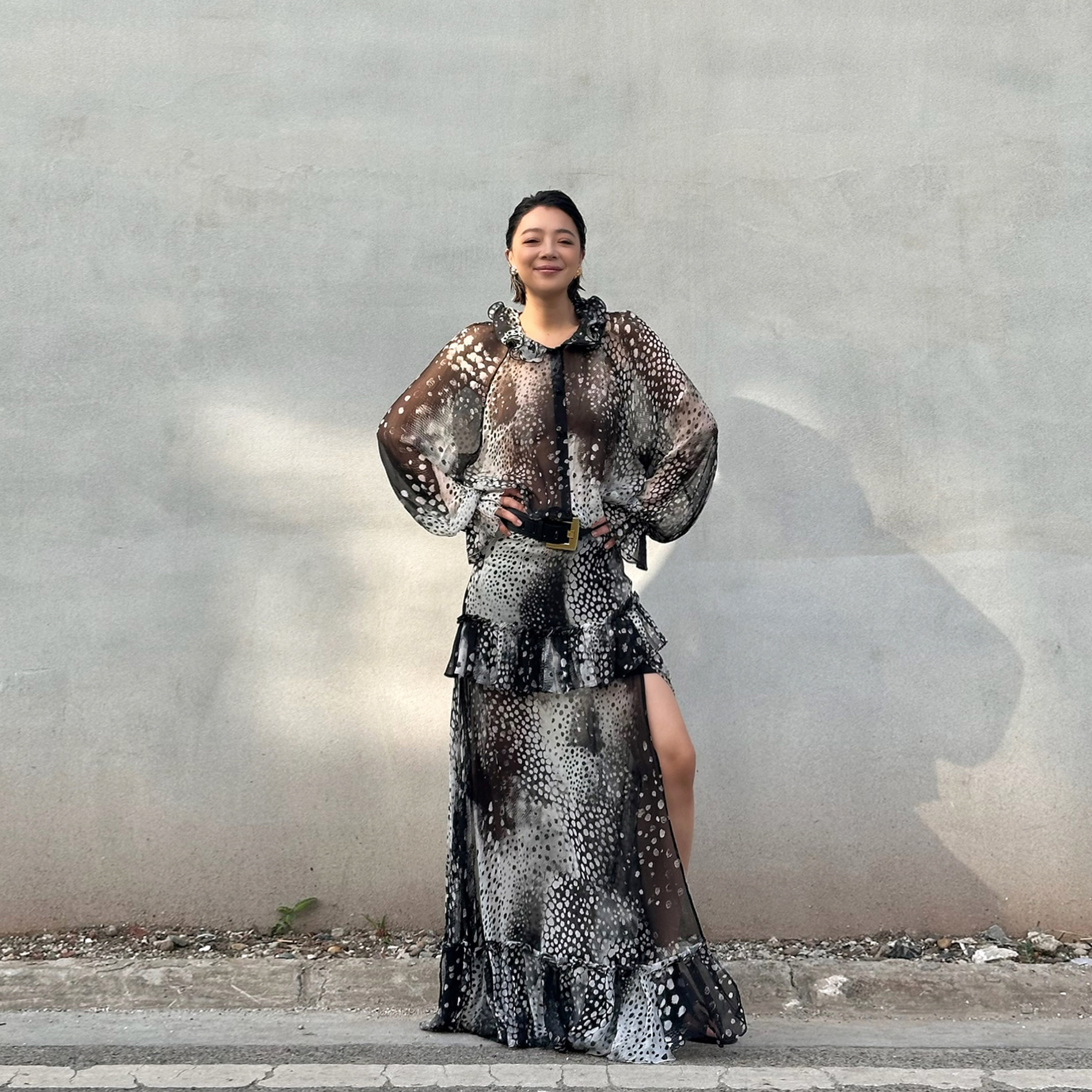 珠光雪纺飘逸不规则衬衫 Xinlei Lin 微醺流光 不规则蕾丝半裙套装