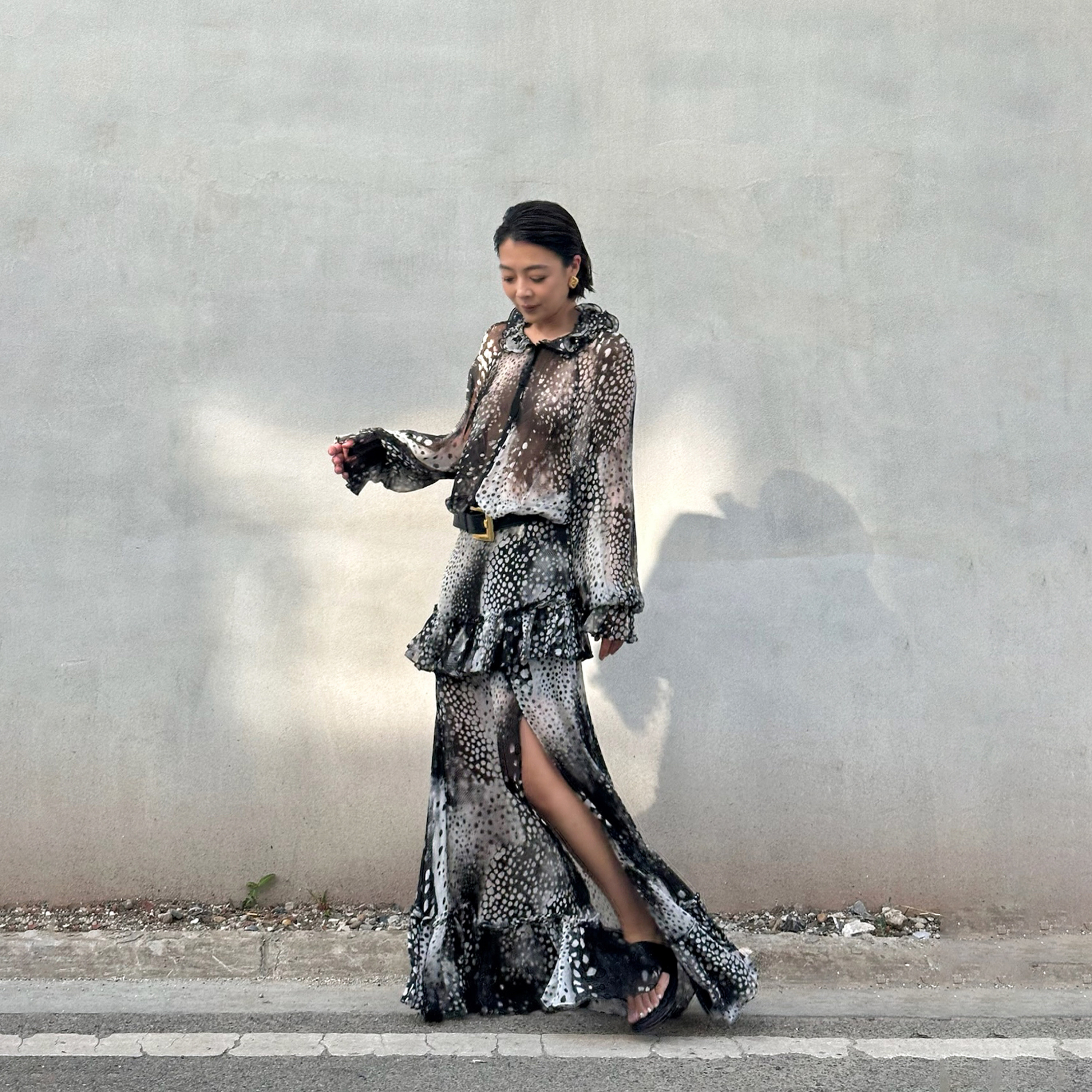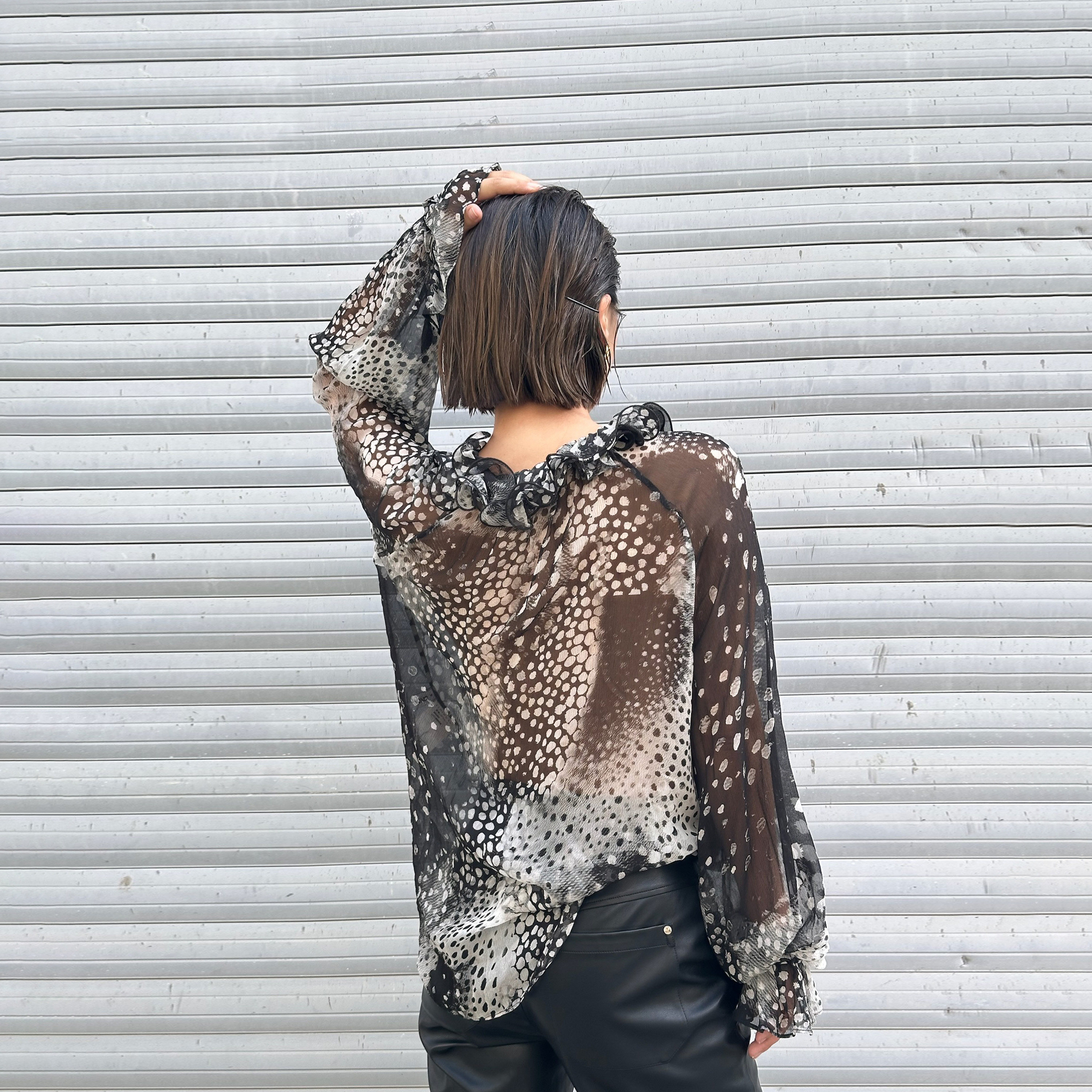 LEDIM 野性豹纹解构雪纺荷叶领衬衫 女黑色上衣25秋新款 WANG黑标