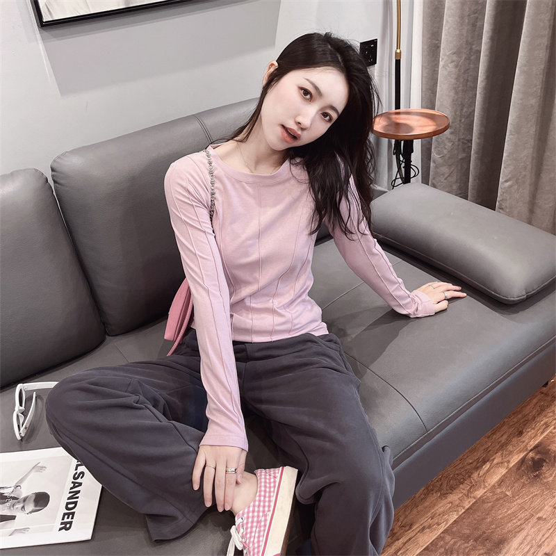 女设计感长袖 叶子小姐 线条T恤 打底衫 圆领纯棉内搭短上衣 修身