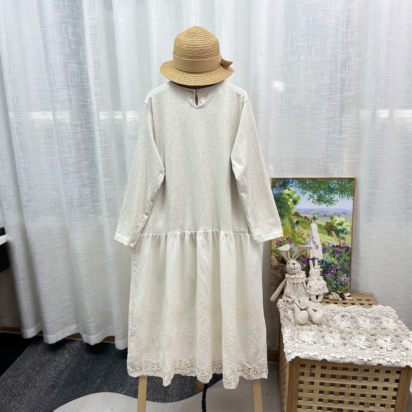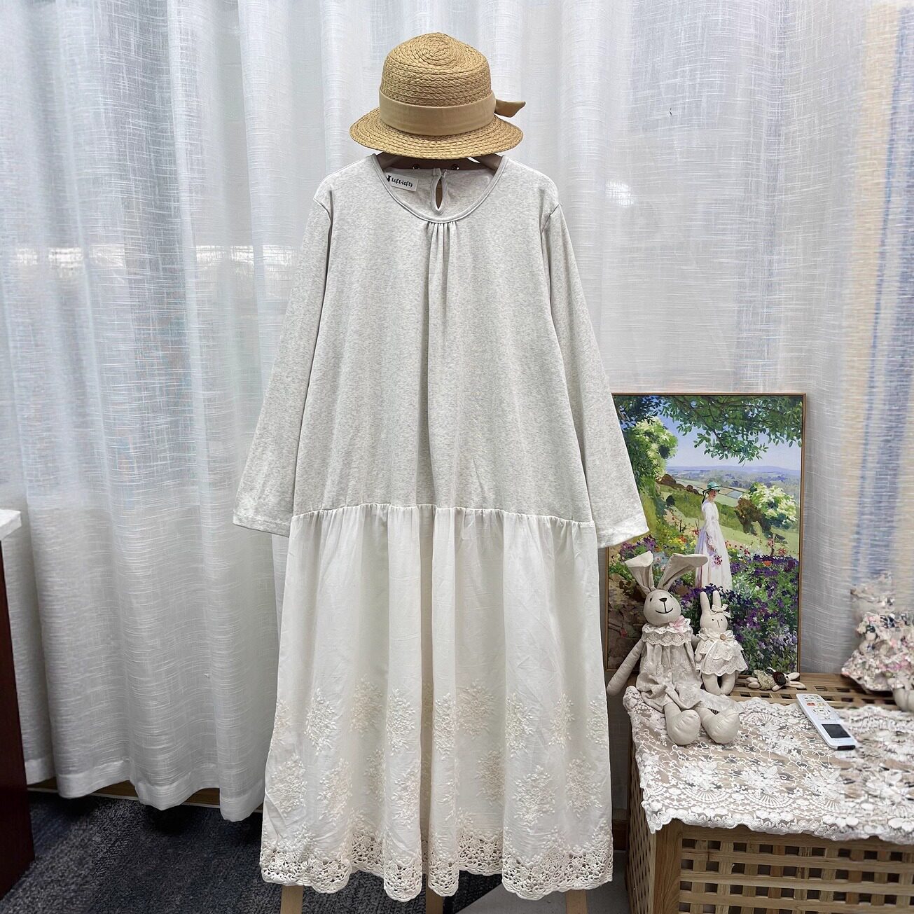 T恤连衣裙 25秋森系圆领高弹力针织棉拼接水溶花刺绣花边下摆长款由