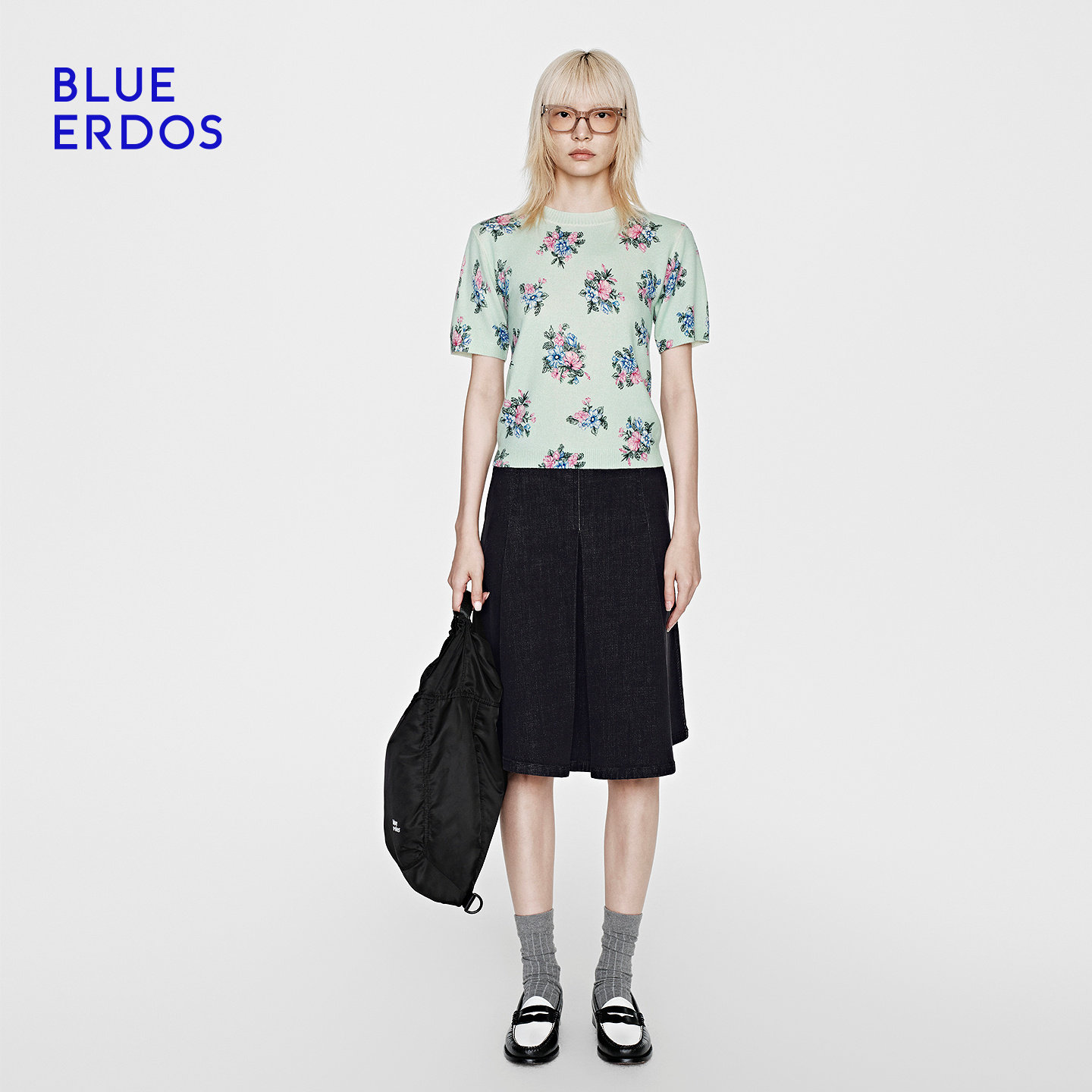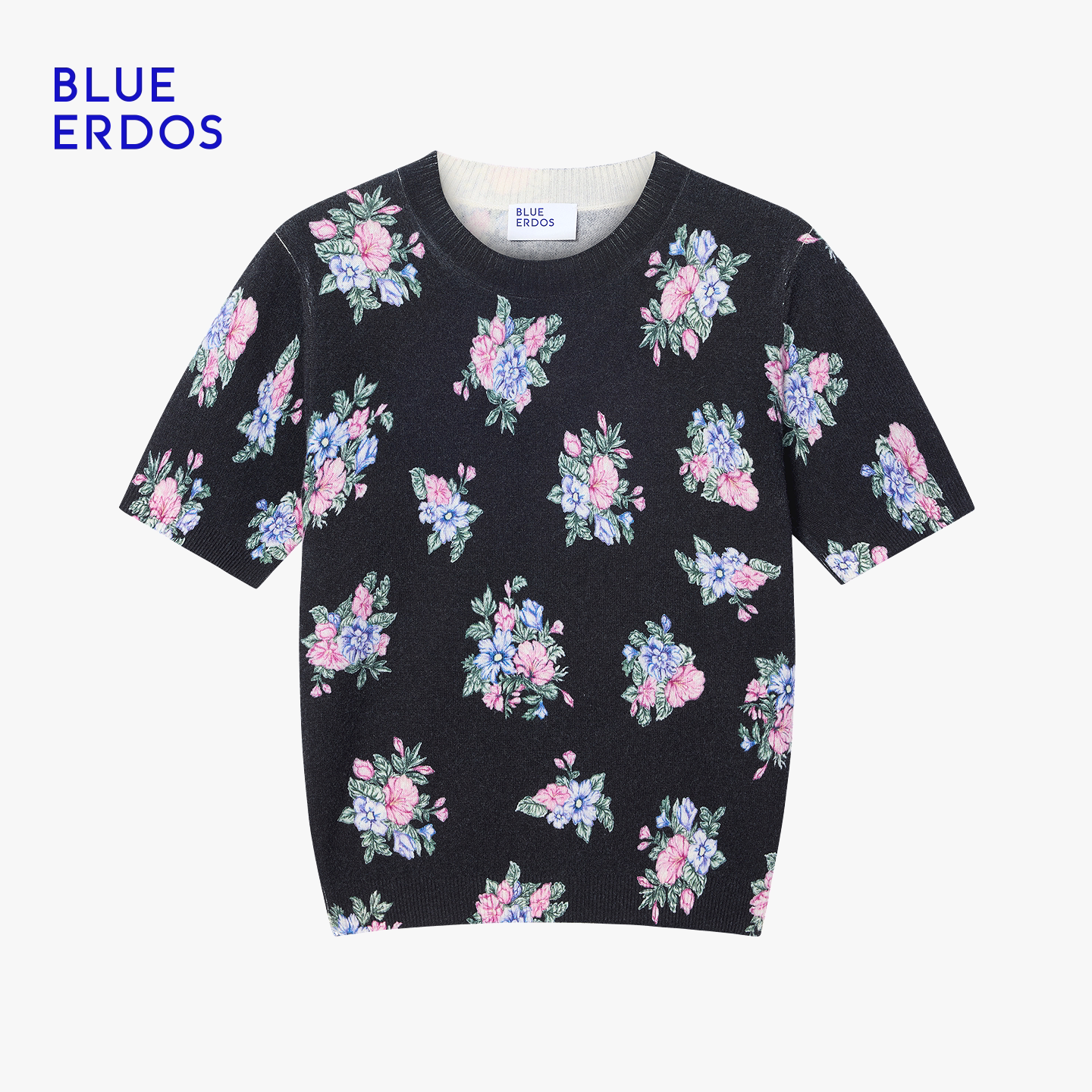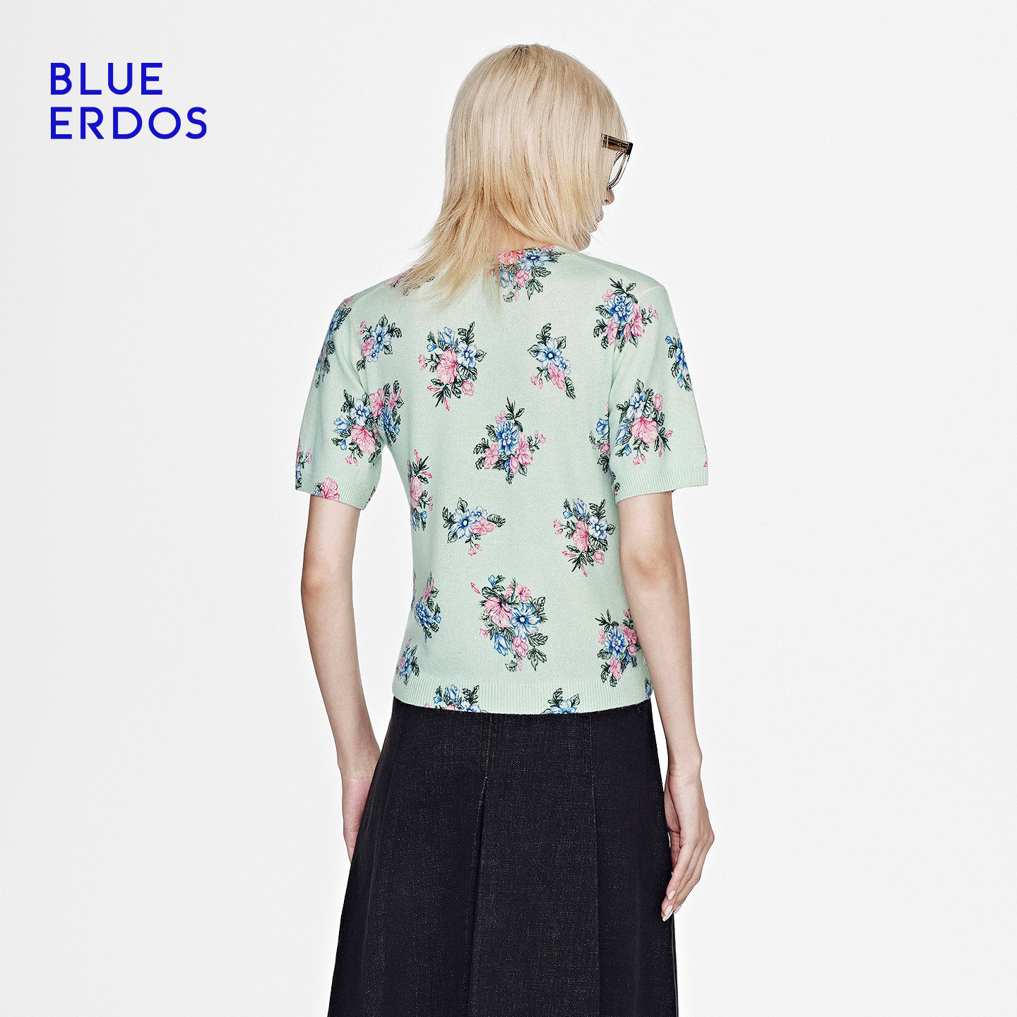 复古印花圆领针织半袖 套衫 新品 ERDOS26夏季 100%山羊绒 BLUE