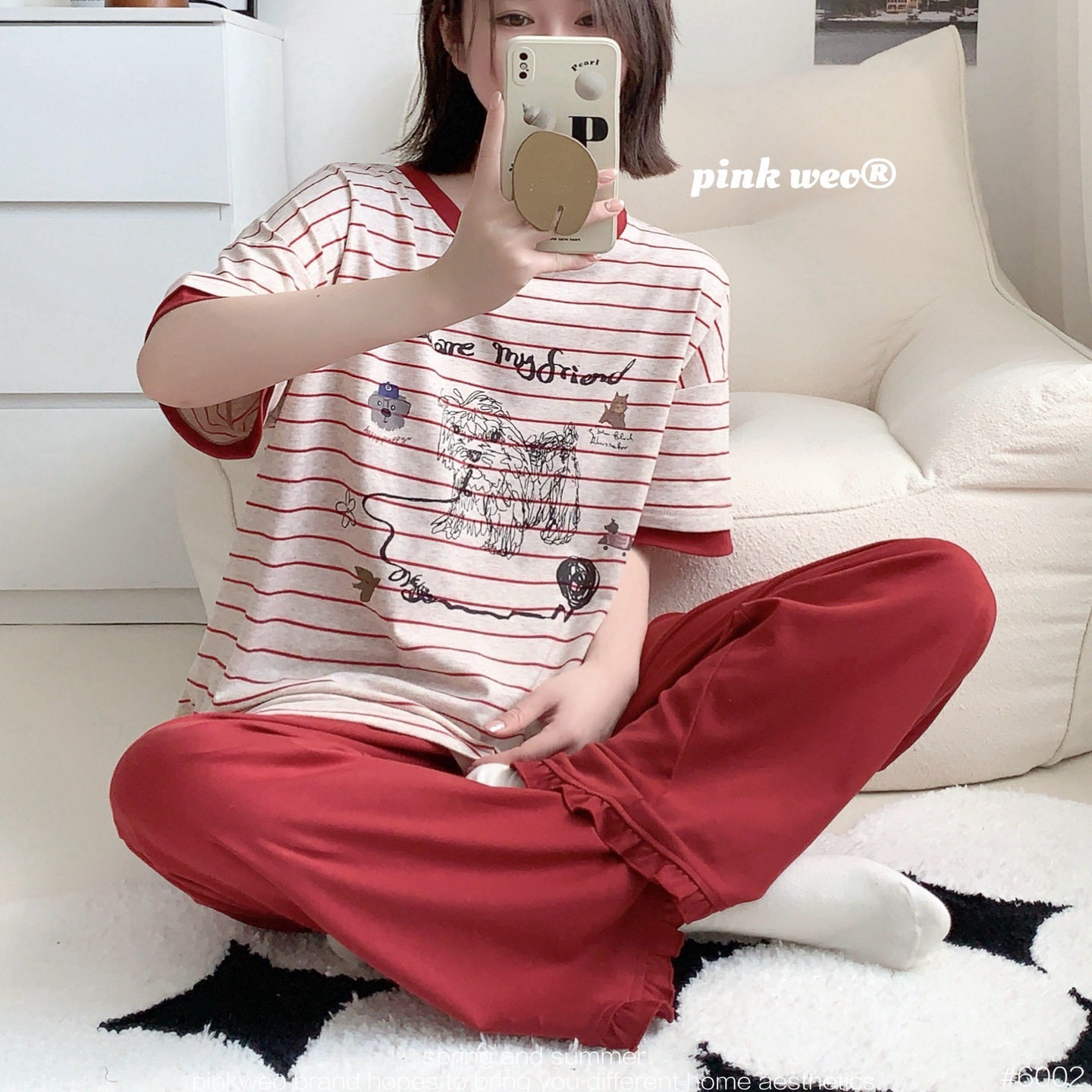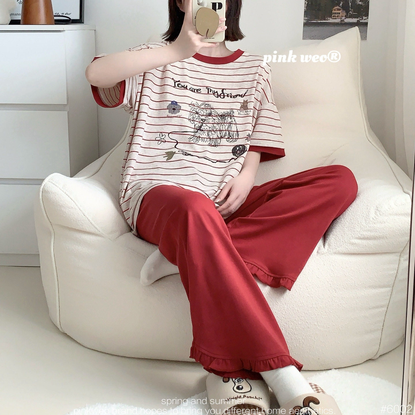 女士睡衣短袖 休闲条纹狗狗花边韩版 宽松纯棉薄款 春季 PINKWEO 长裤