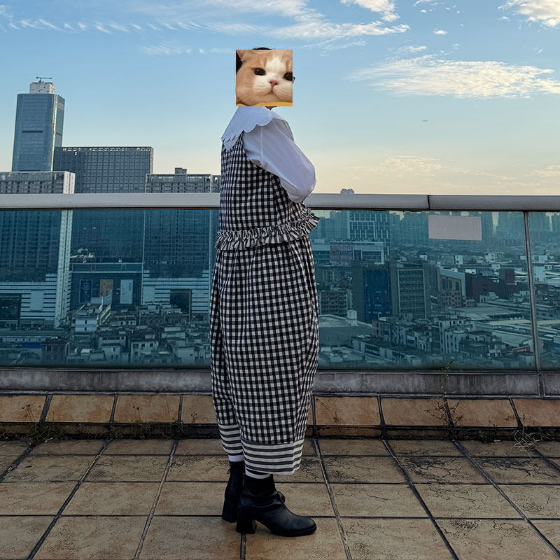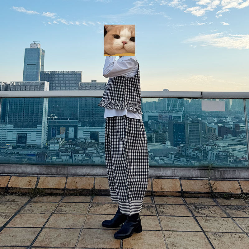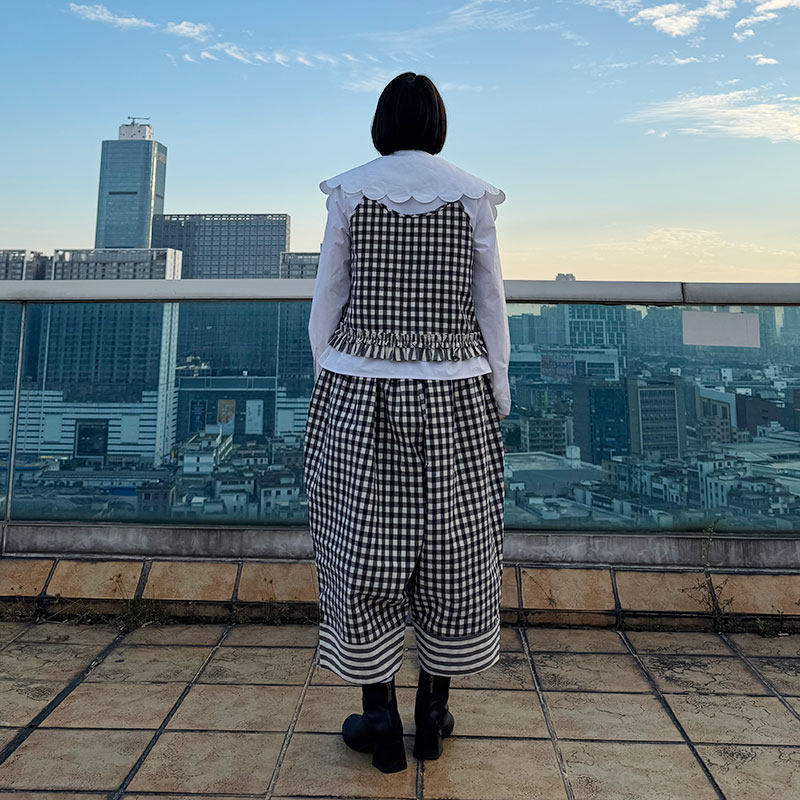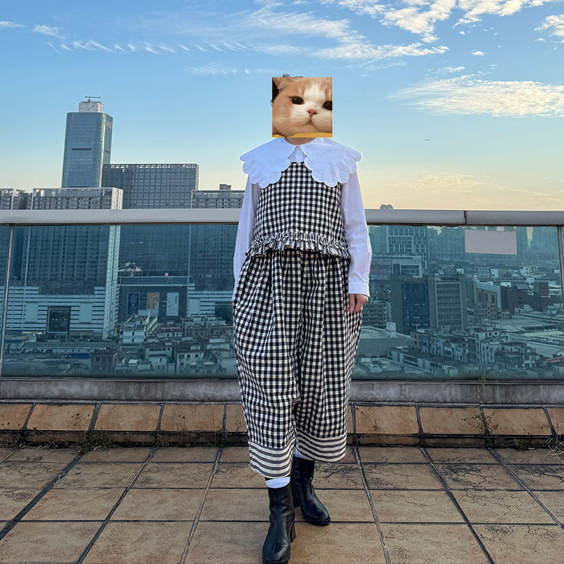 扎实面料宽松外穿内搭娃娃领背心上衣 自产自销黑白格纹吊带女由
