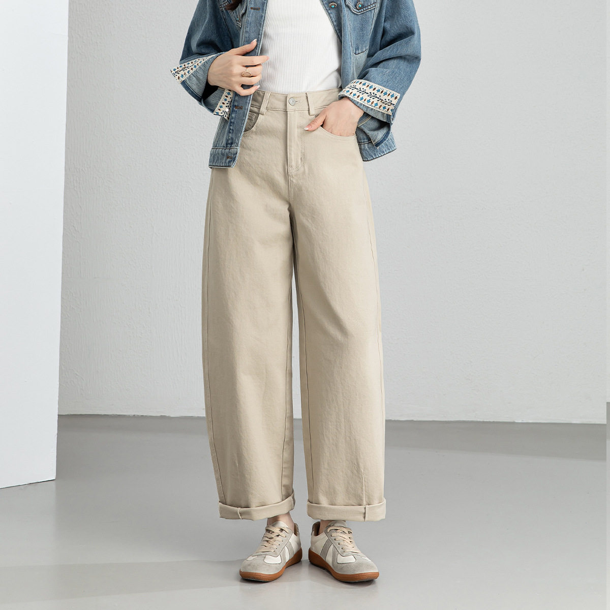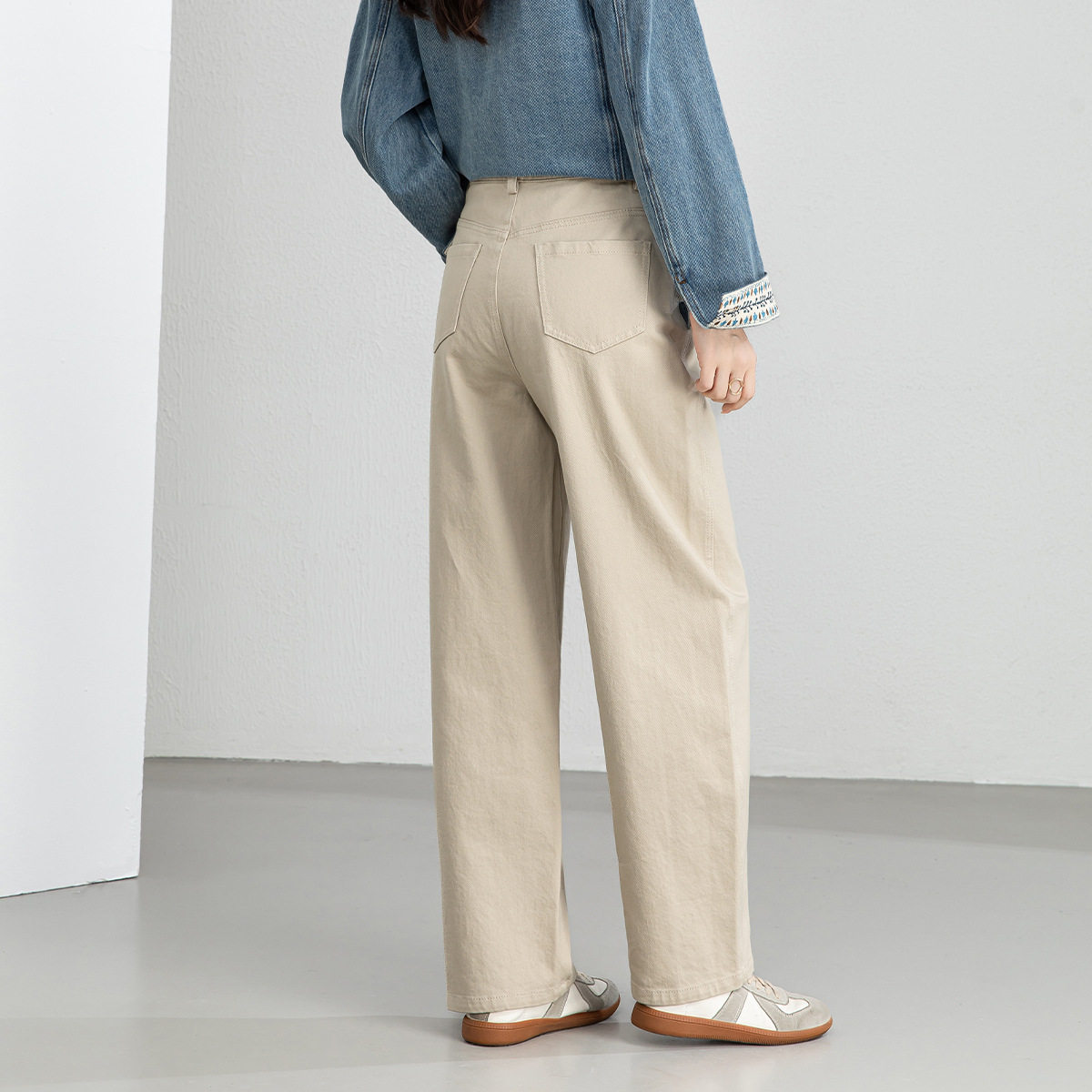 橘子树在哪儿复古卡其色拼接牛仔裤 子 女春秋设计感直筒阔腿垂感裤