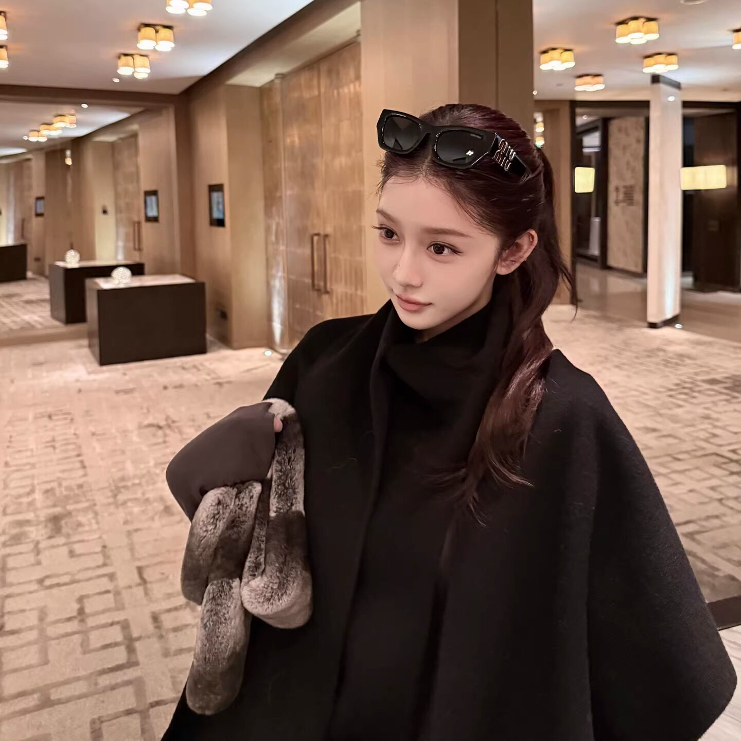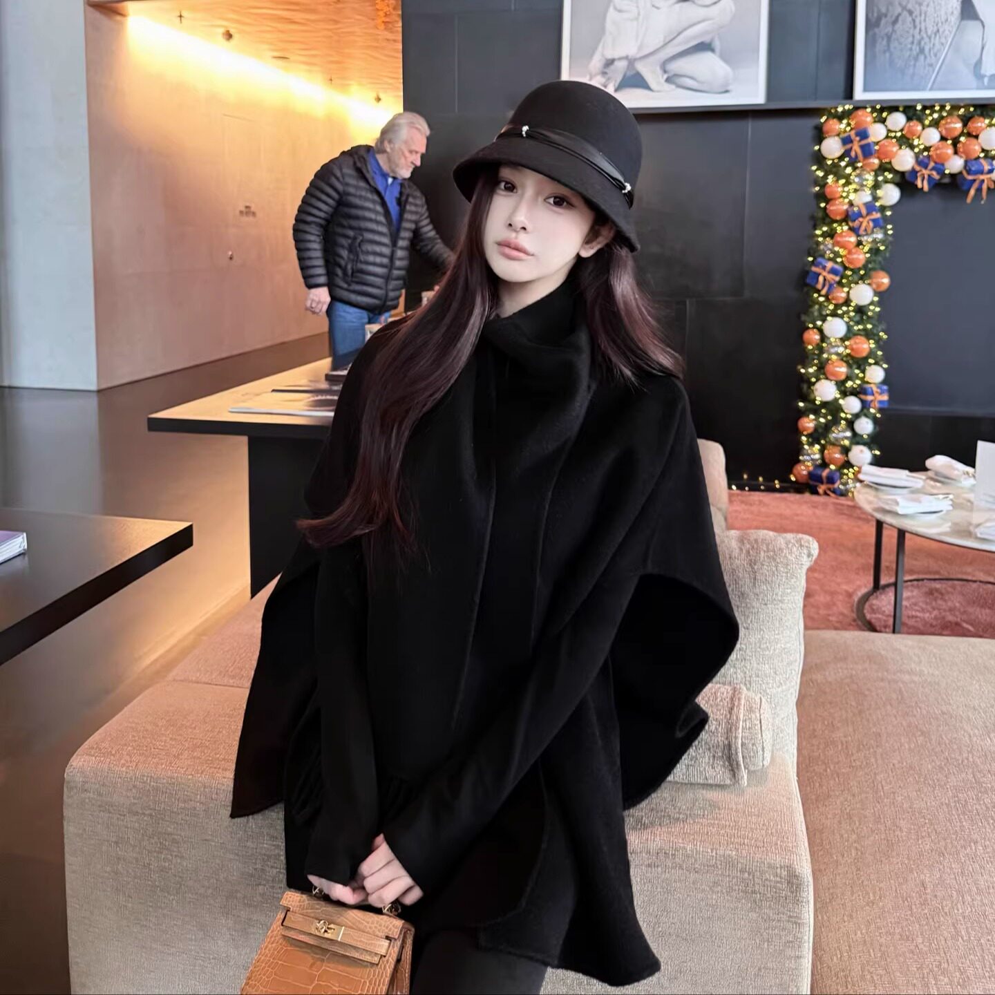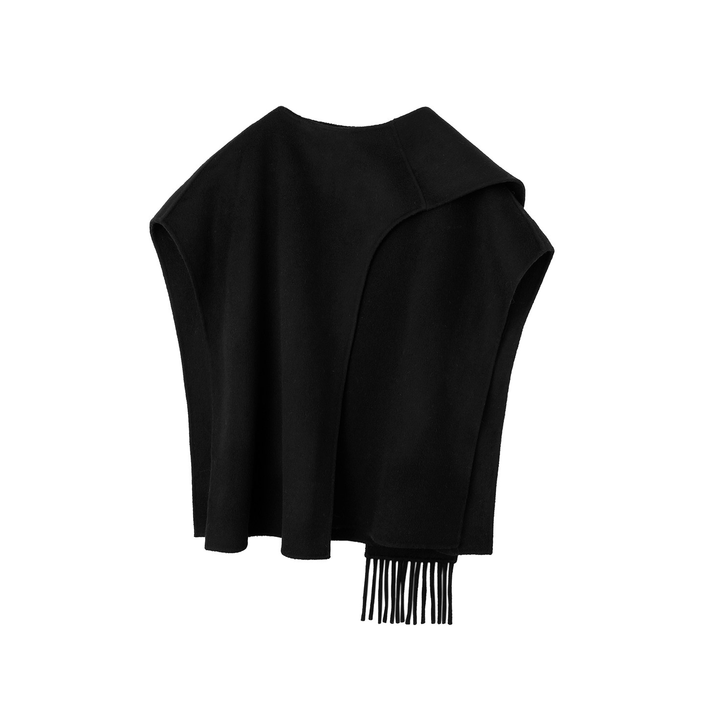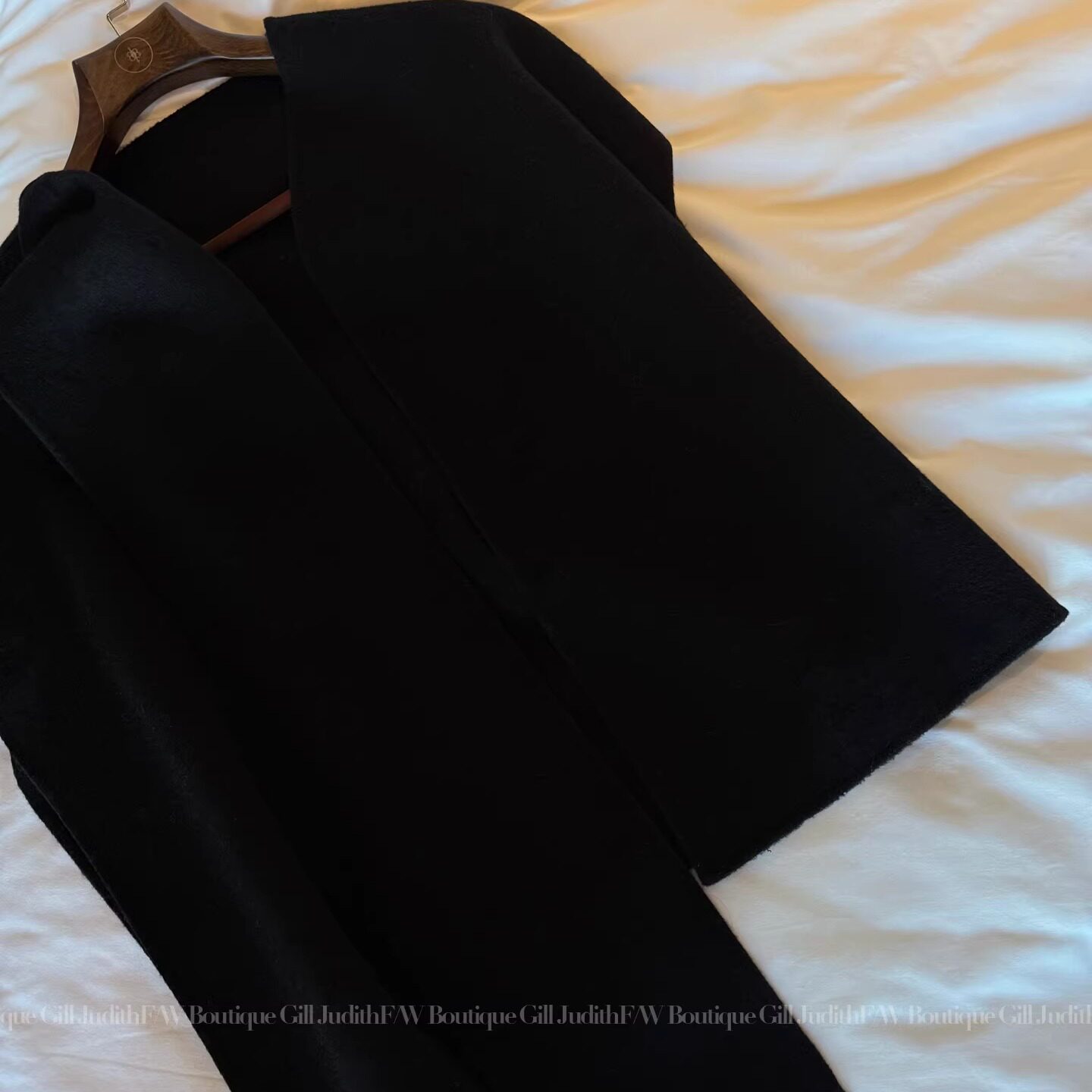 92.8绵羊毛7.2山羊绒 不规则流苏围巾双面呢大衣 高级黑 韩雨嘉由