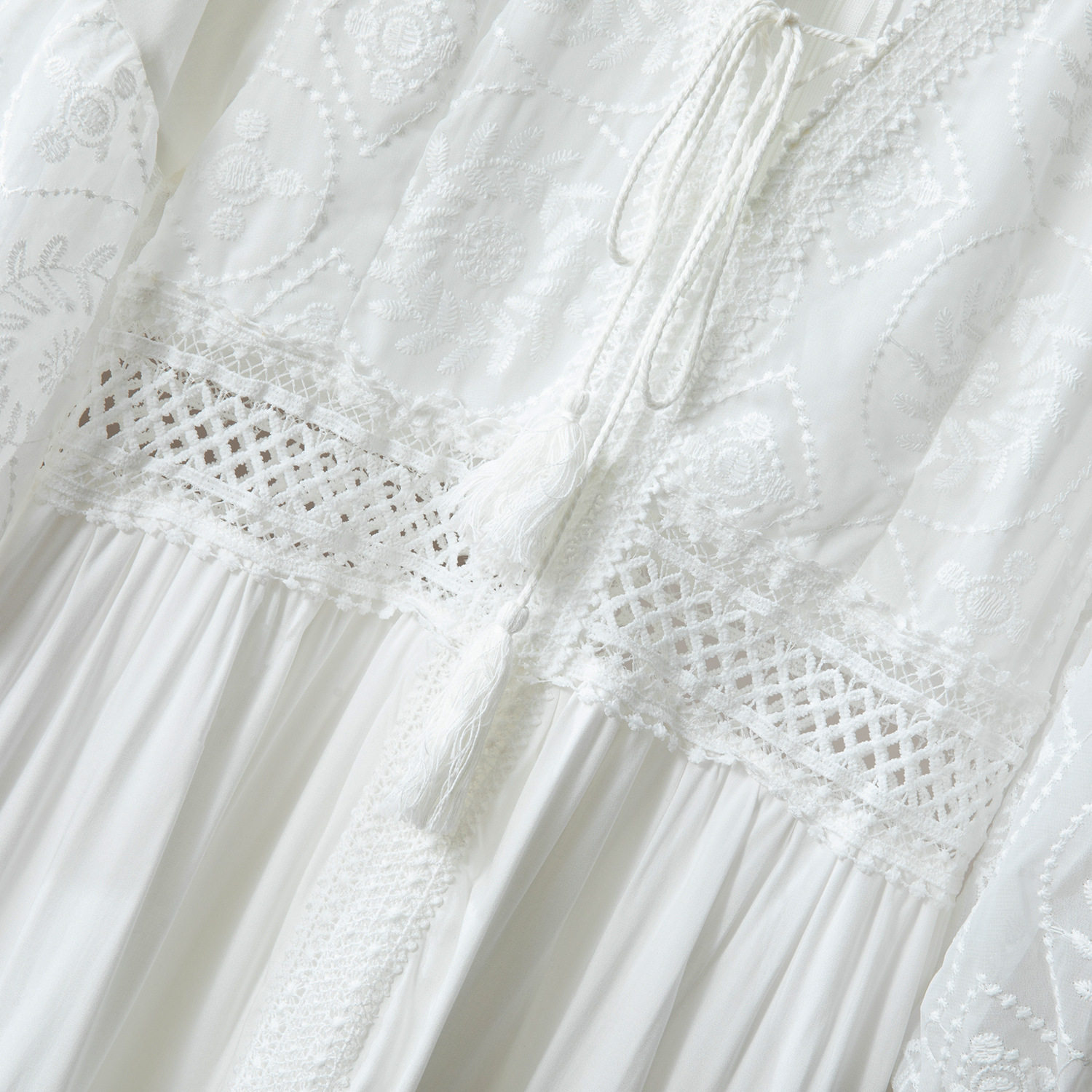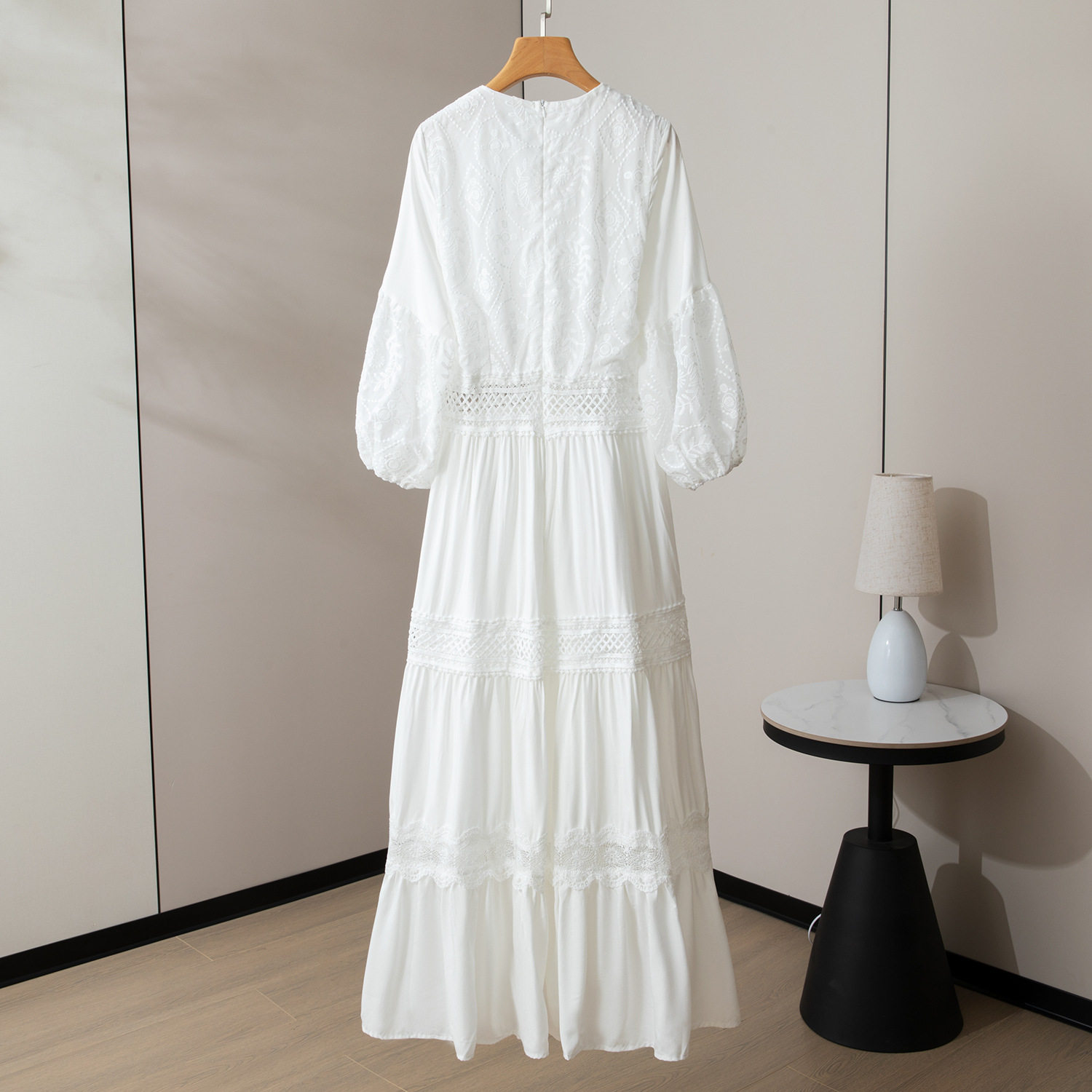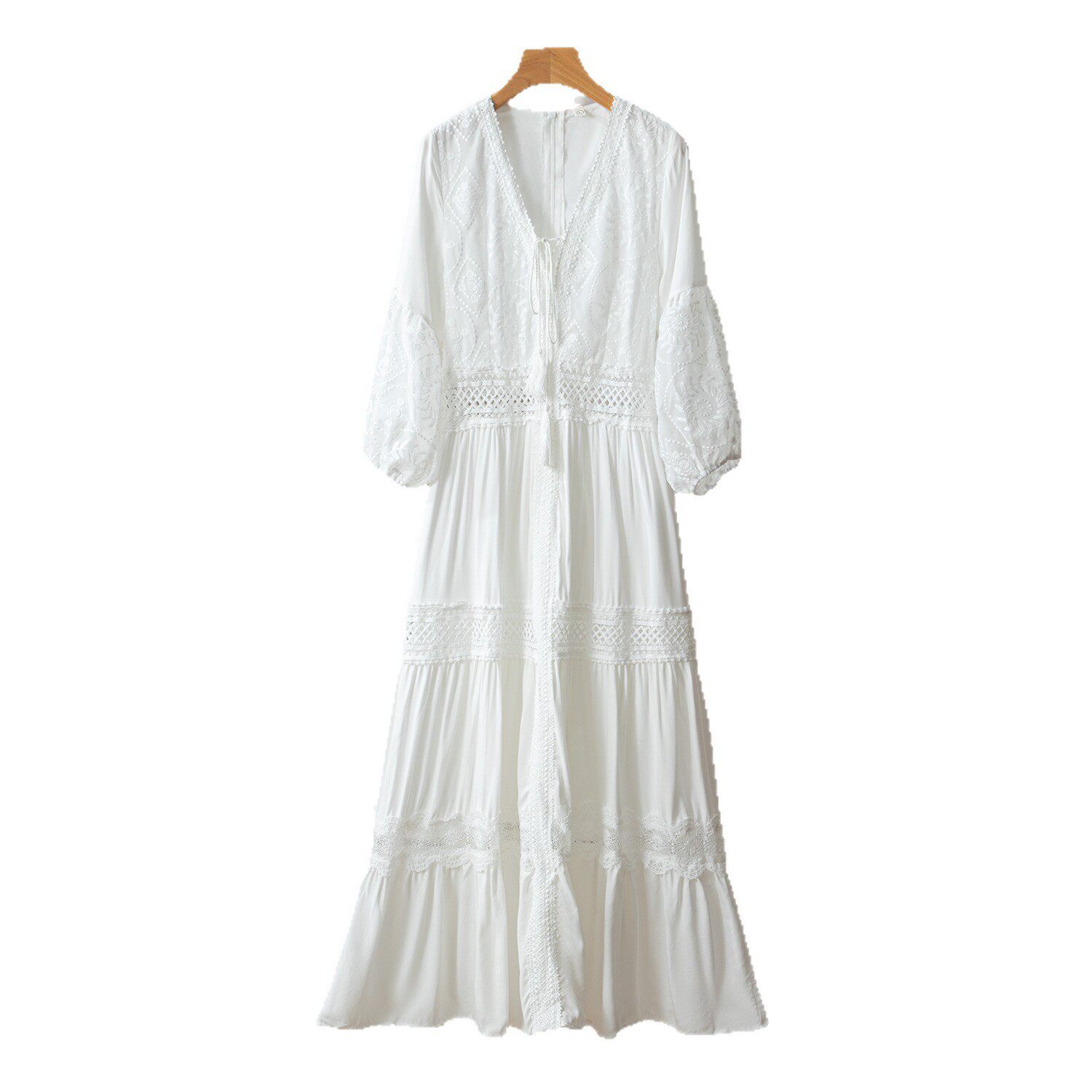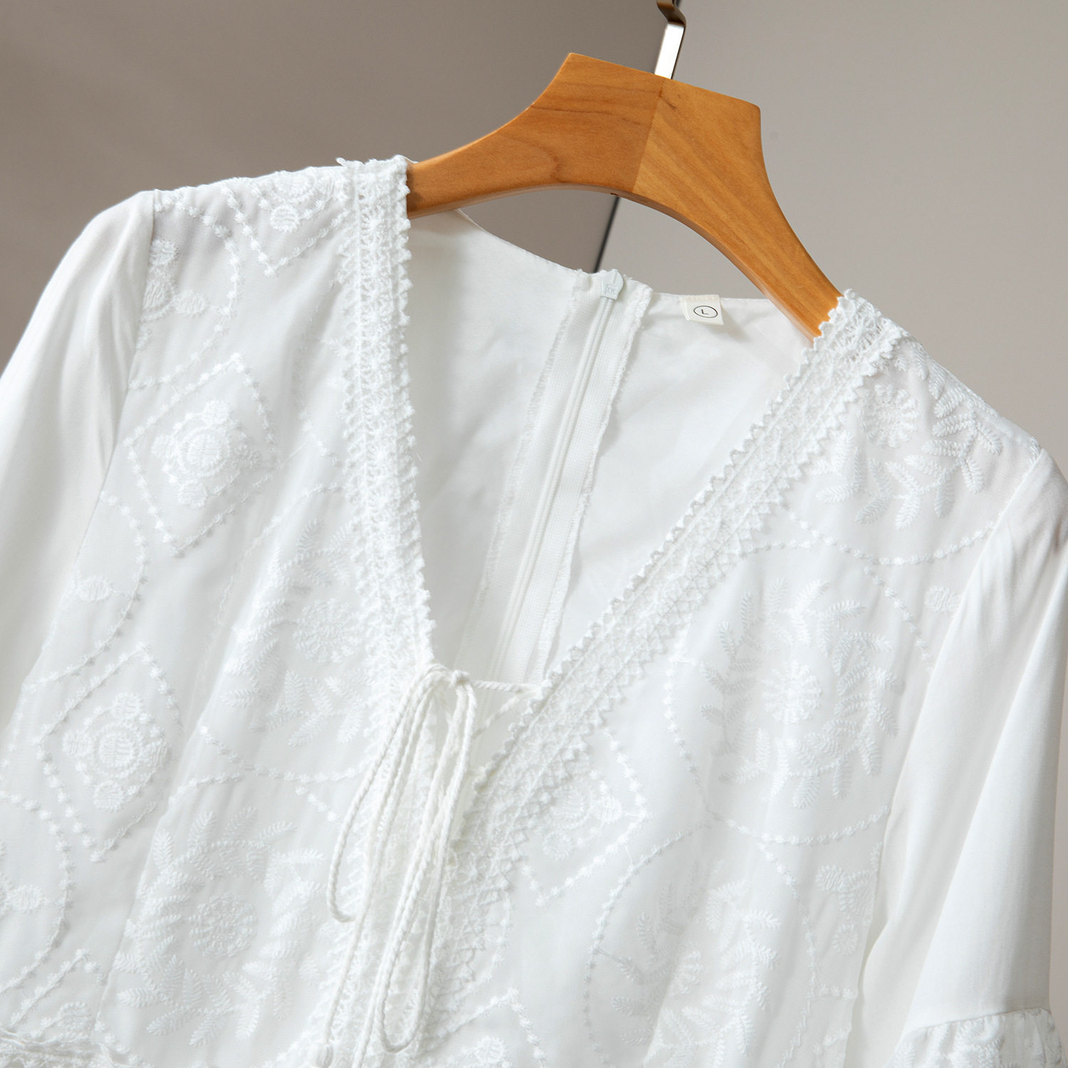 白胚七分袖 文艺收腰春秋中长裙白色可扎染 V领镂空刺绣连衣裙女装由