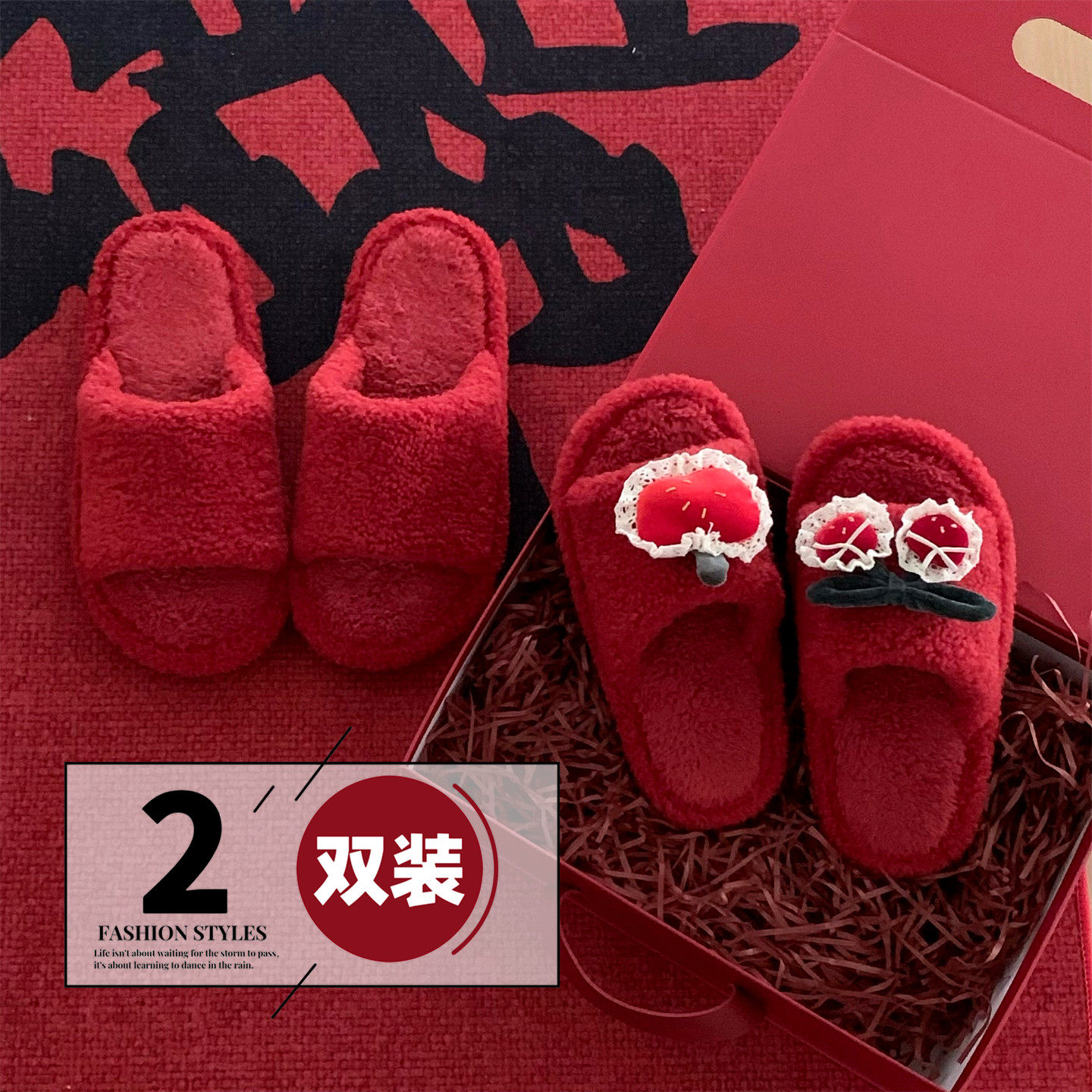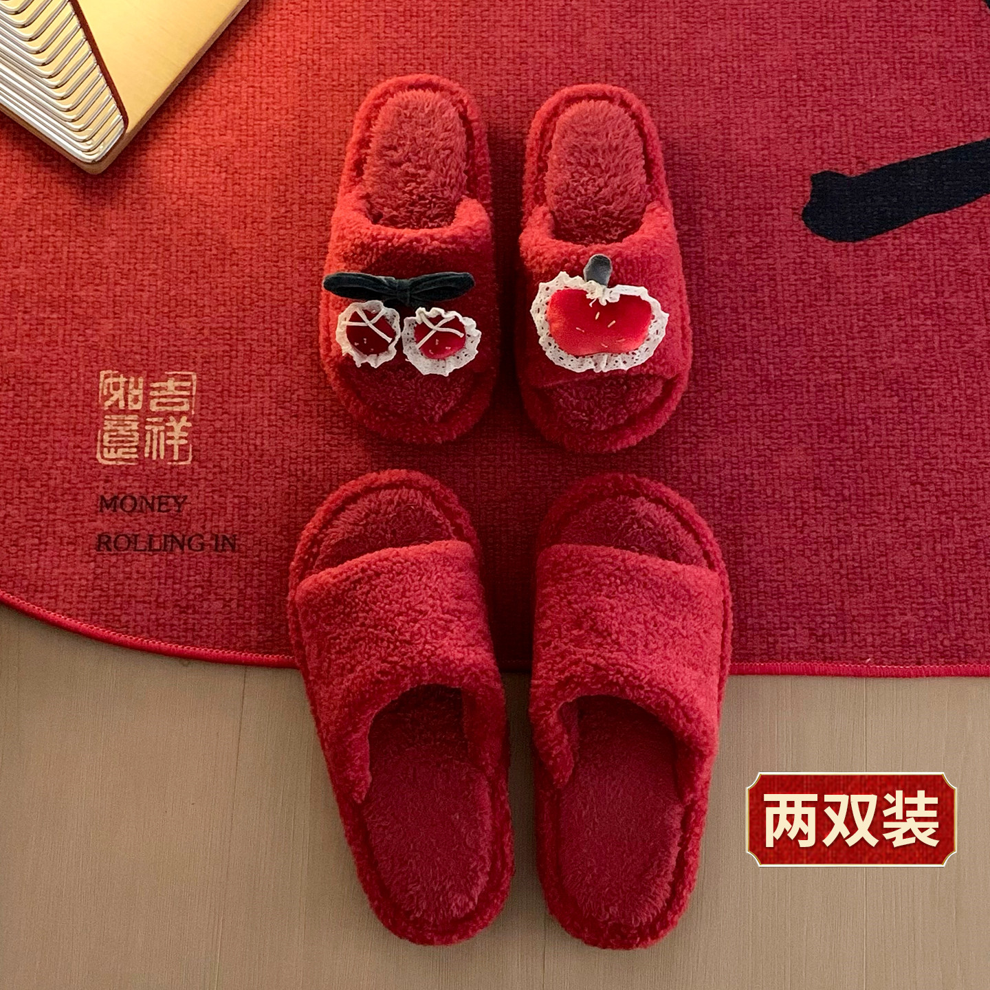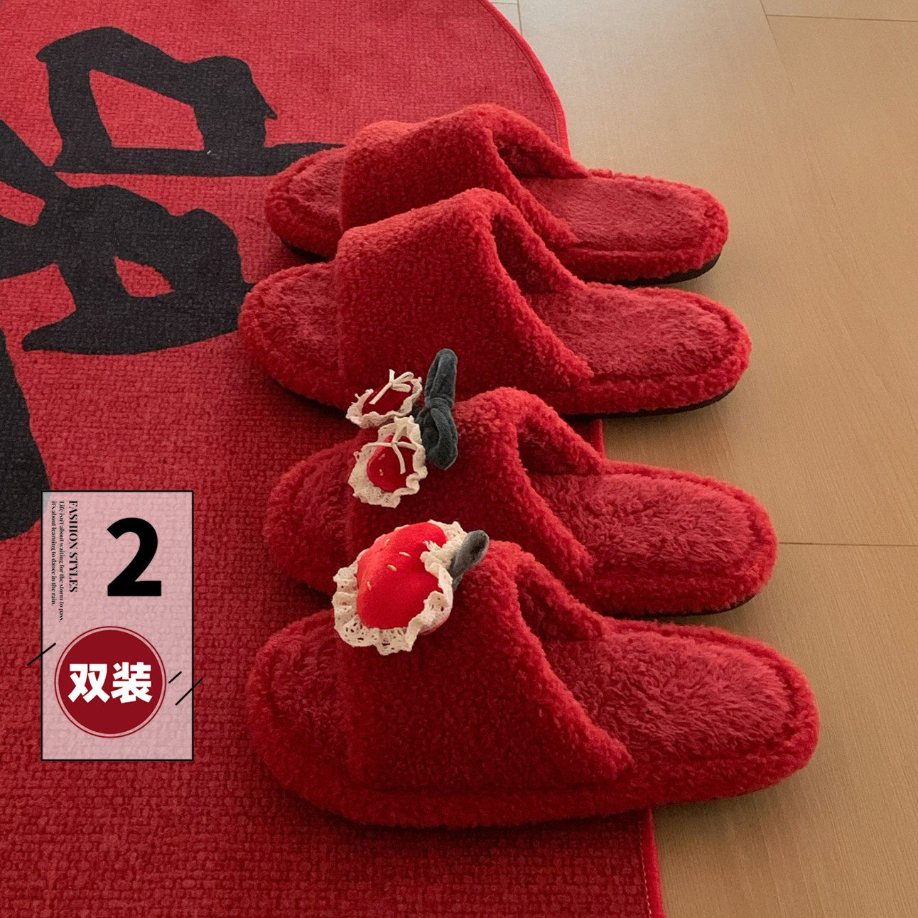 为您提供商品细细条 新婚家居鞋 男女ins红色陪嫁防滑秋冬甜美樱桃棉拖鞋 两双装的详细介绍,