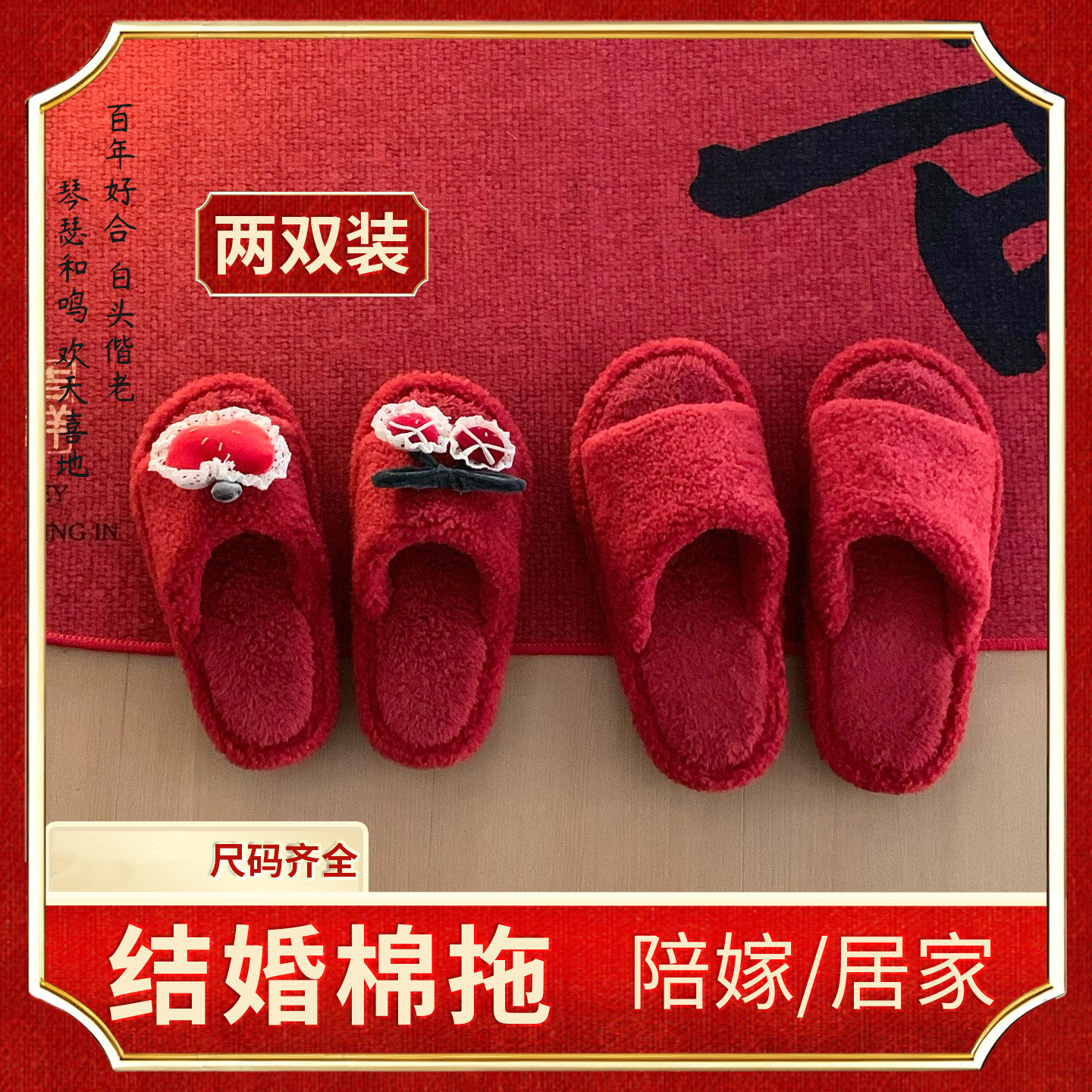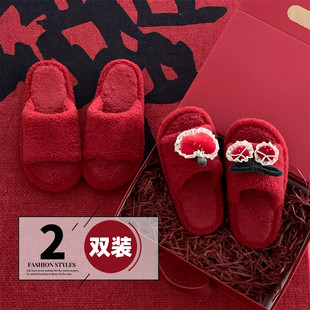 细细条 新婚家居鞋 男女ins红色陪嫁防滑秋冬甜美樱桃棉拖鞋 两双装