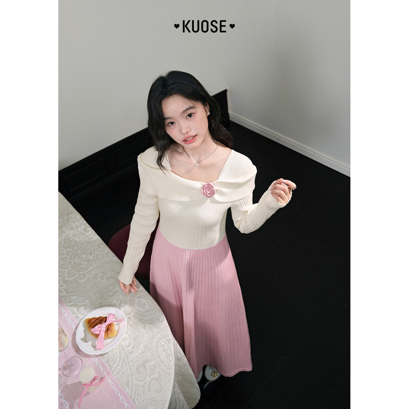 新款 杏色假两件a字长裙春 一字肩针织连衣裙子女25秋冬季 阔色法式由