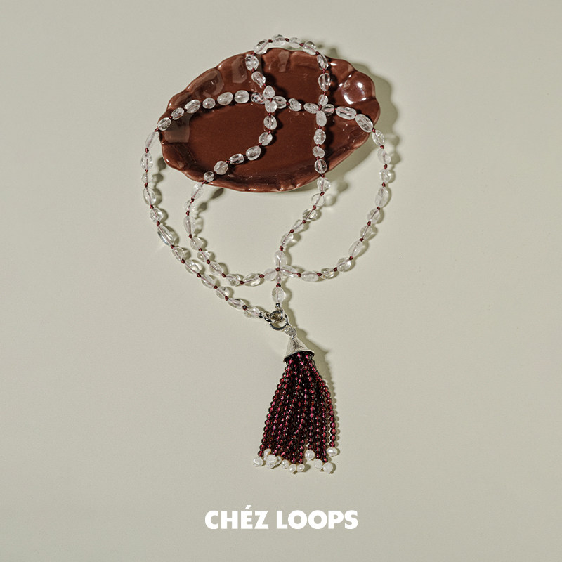CHEZ LOOPS松果黑玛瑙石榴珍珠流苏项链原创设计白水晶链镀金长款由