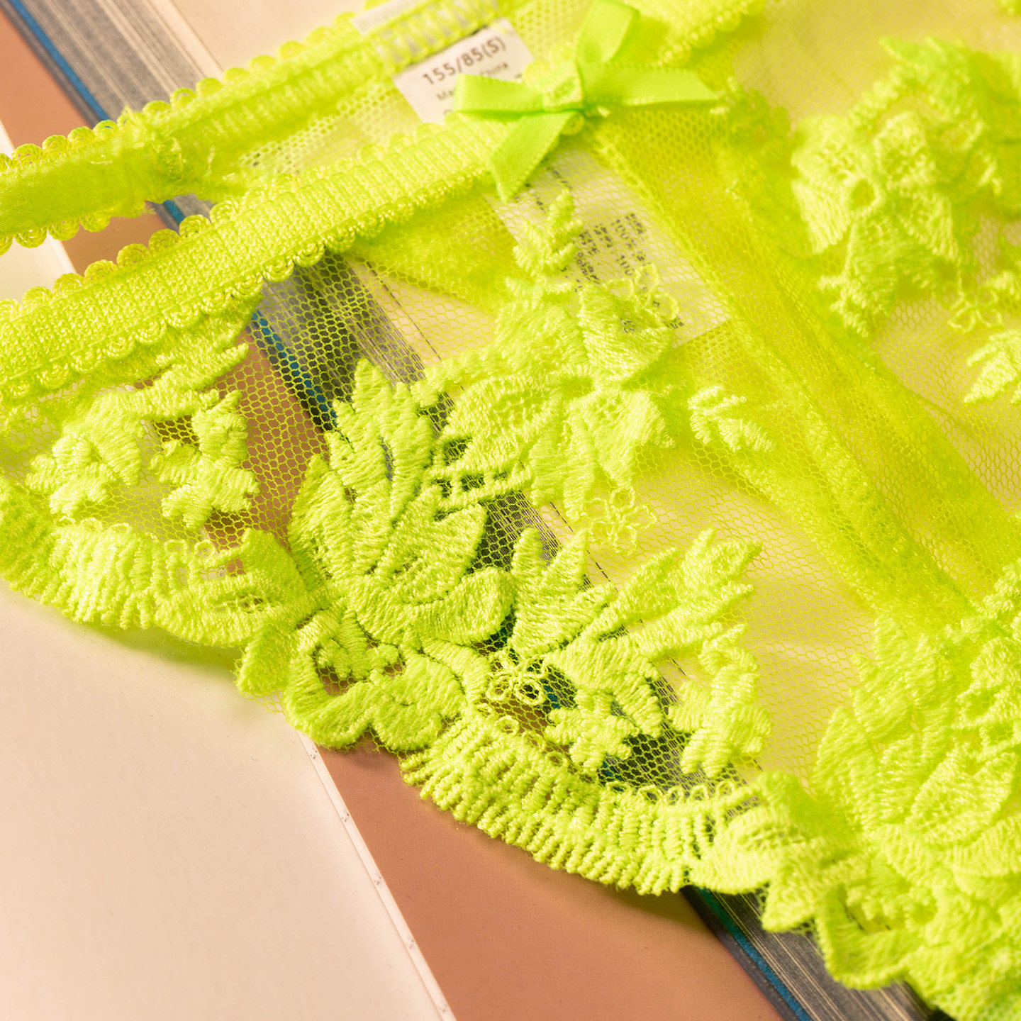 性感蕾丝丁字裤 荧光绿欧美运动健身T 女无痕内刺绣花边网纱透明T裤