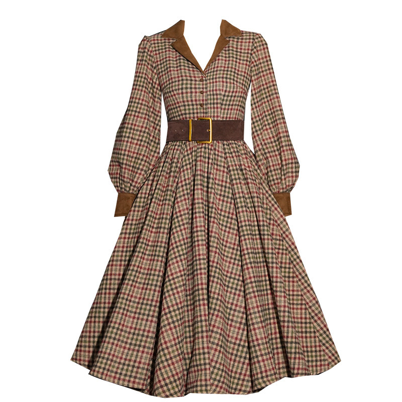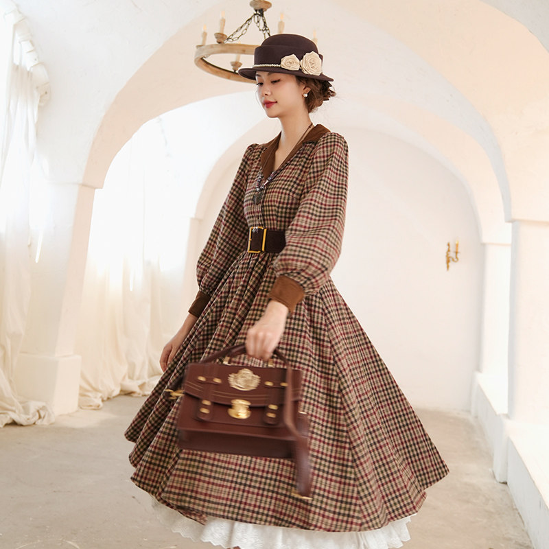 弥爱原创 英伦复古加厚毛呢格纹vintage风高腰连衣裙 榛果饼干由