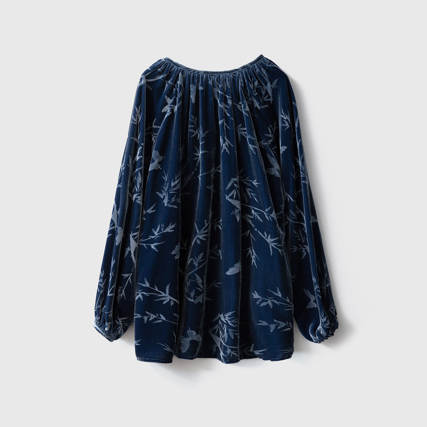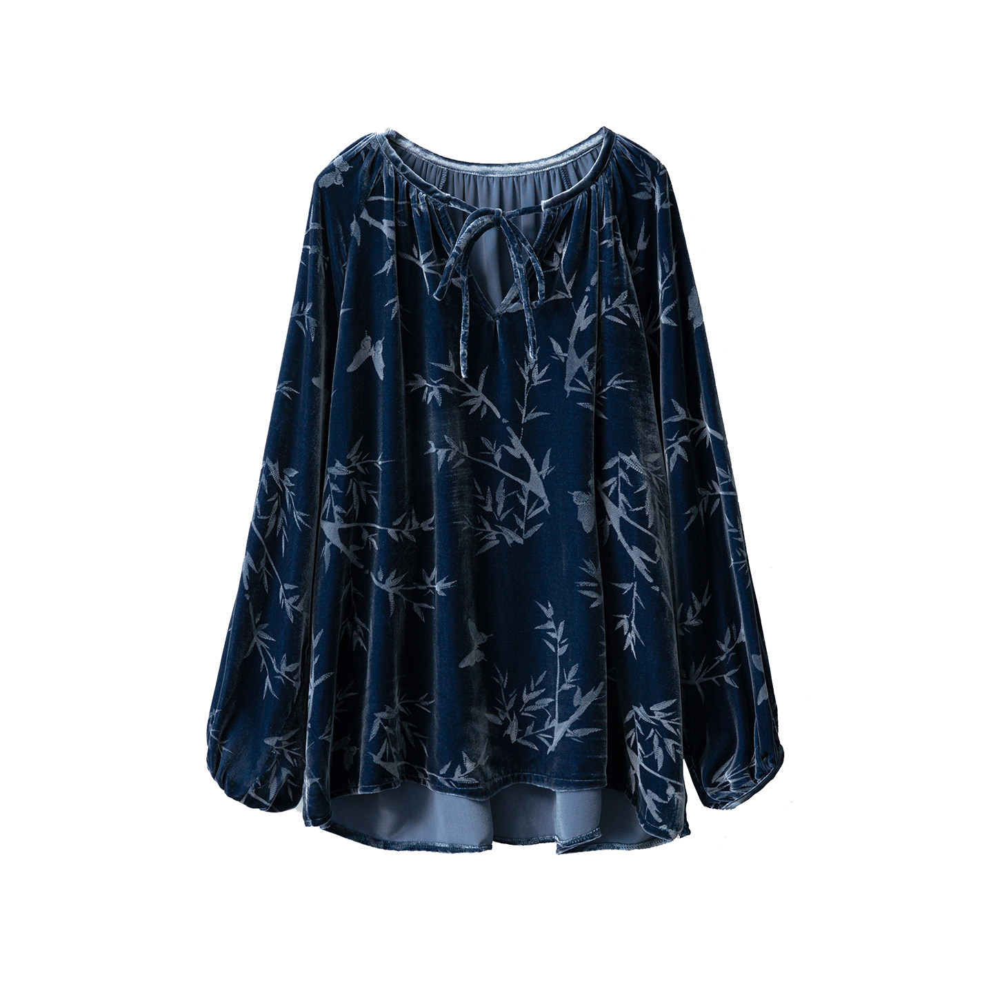 真丝宽松上衣 一丝牵100%桑蚕丝底布丝绒国风圆领蝴蝶结宽松灯笼袖