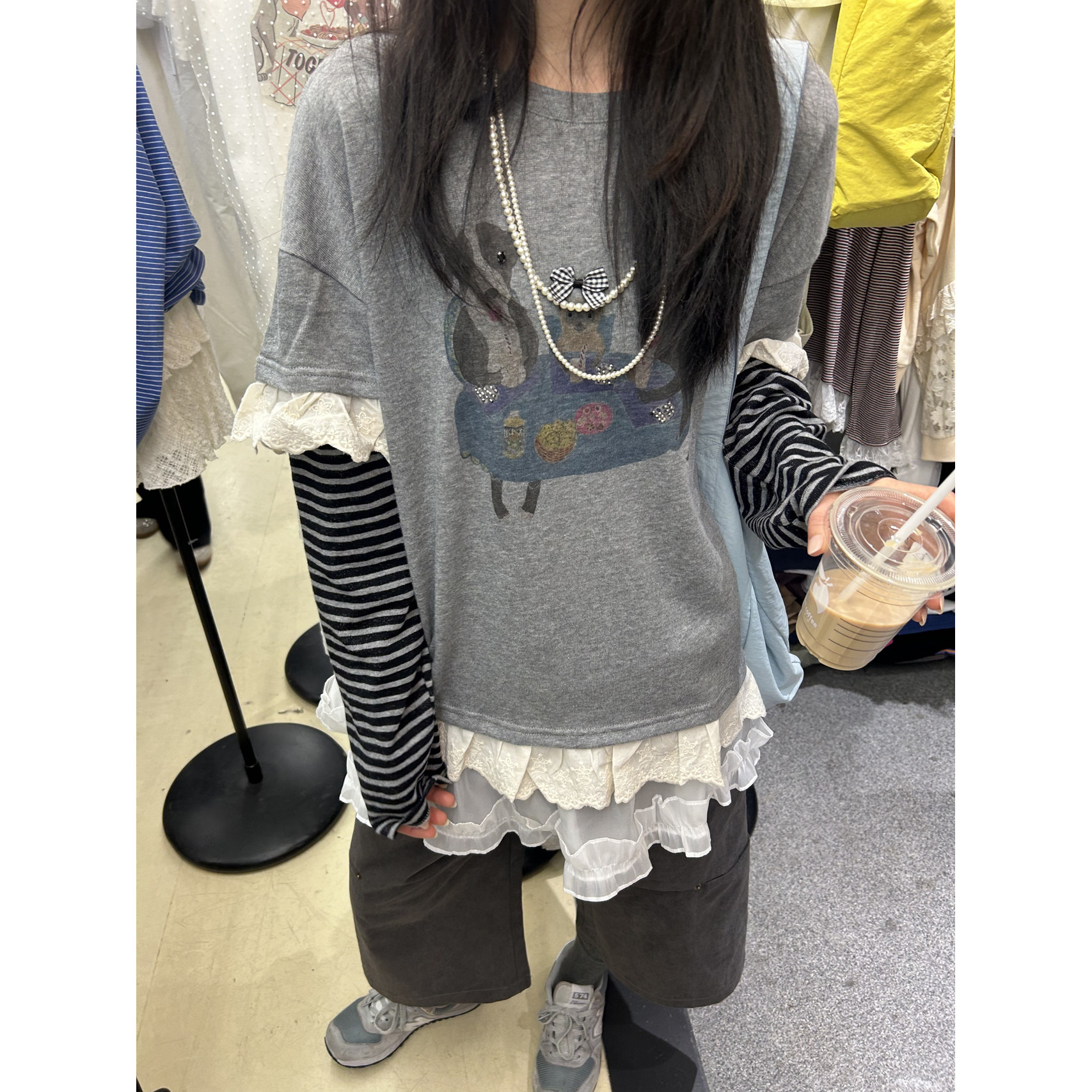 DUODUO 假两件T恤上衣350 圆领卡通图案蕾丝花边拼接条纹袖