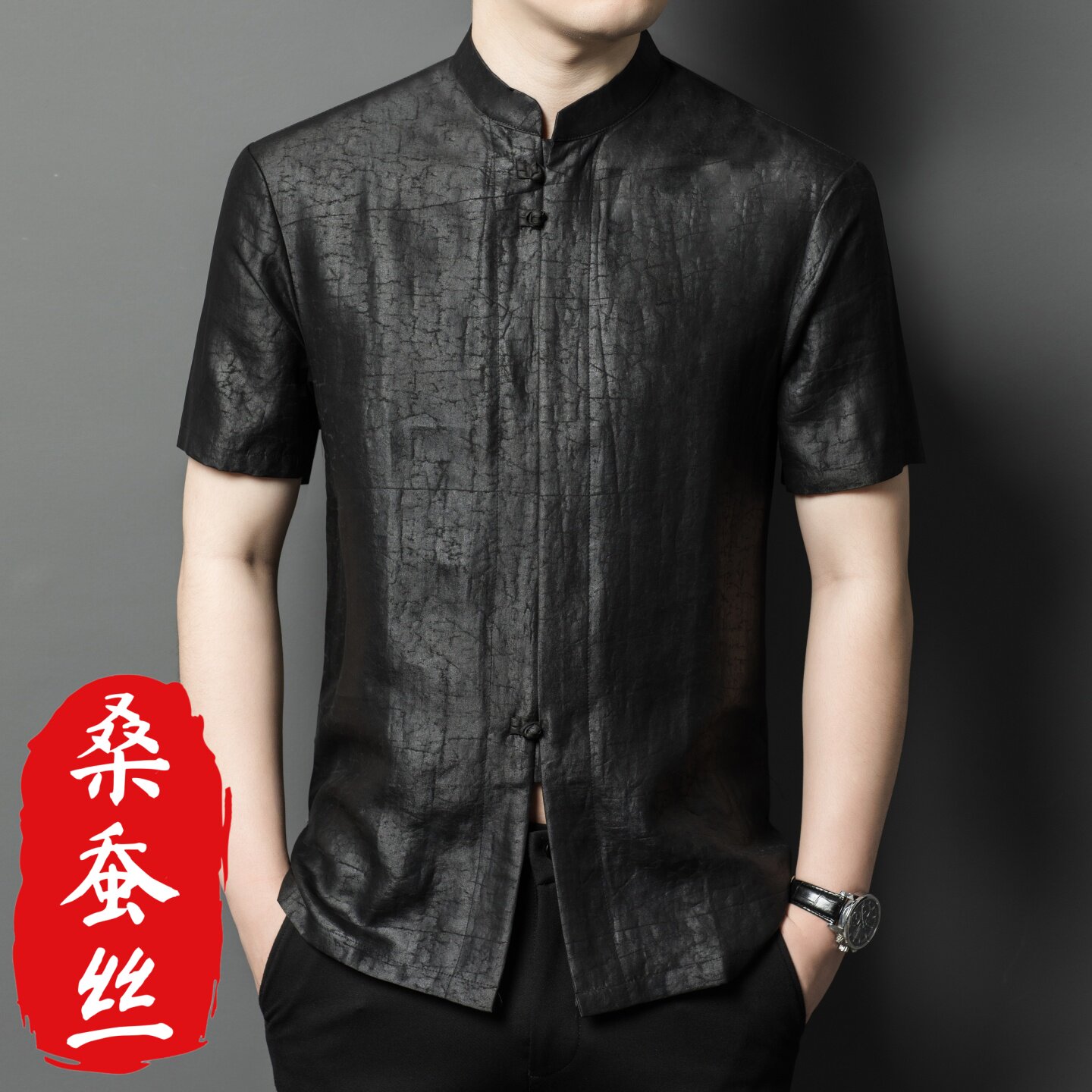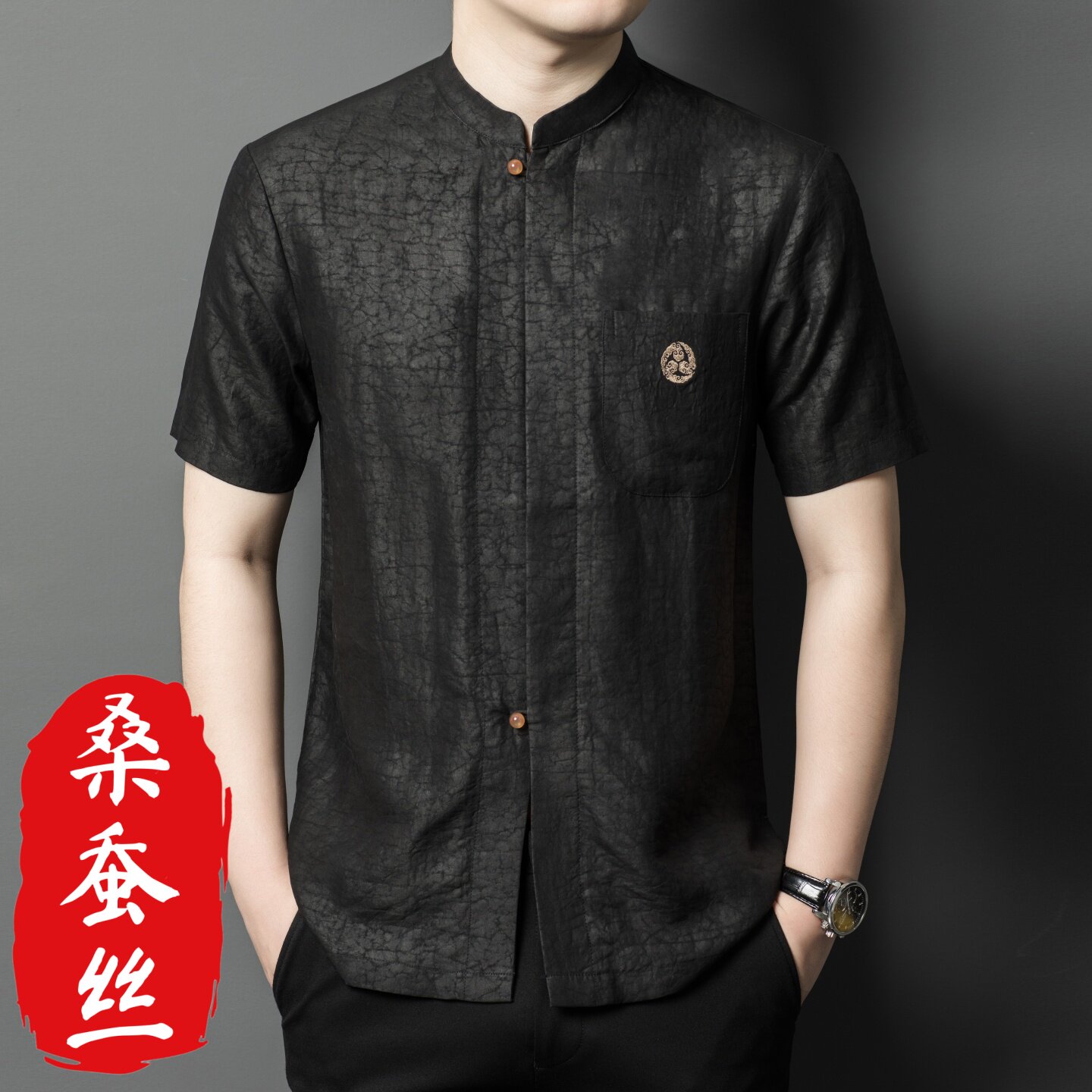 商务休闲衬衫 春竹世家男士 立领夏季 短袖 100%桑蚕丝真丝香云纱唐装