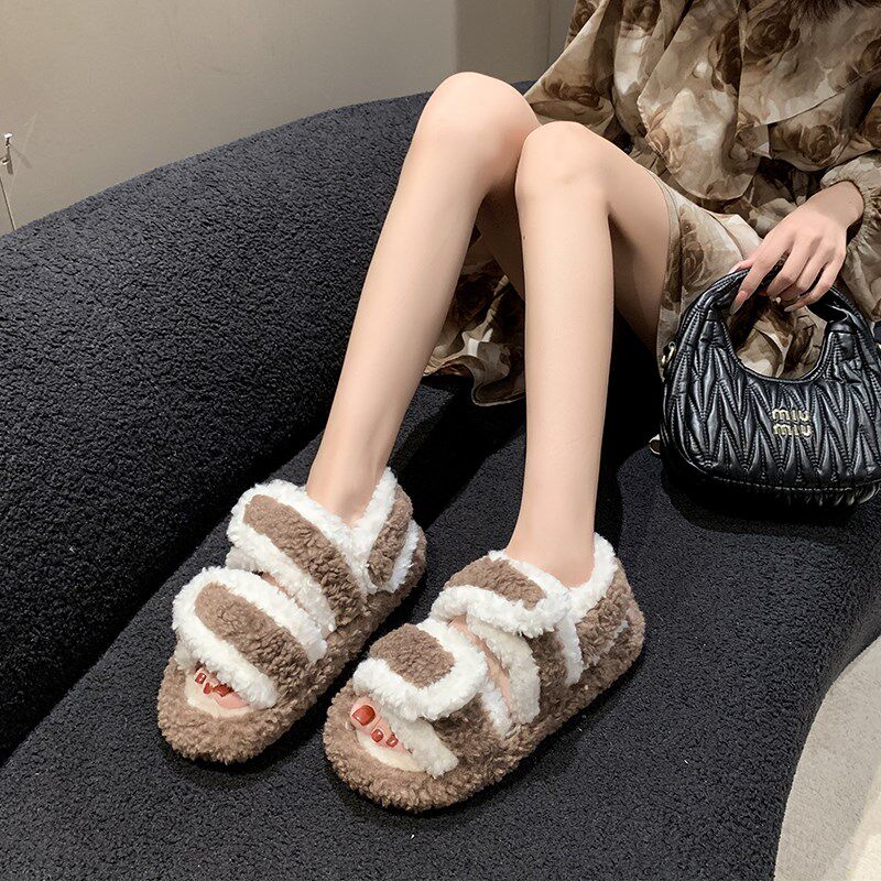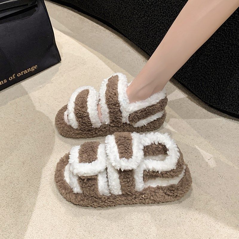 室内居家用办公室漏趾包跟棉拖鞋 女外穿春秋四季 简约厚底毛绒拖鞋