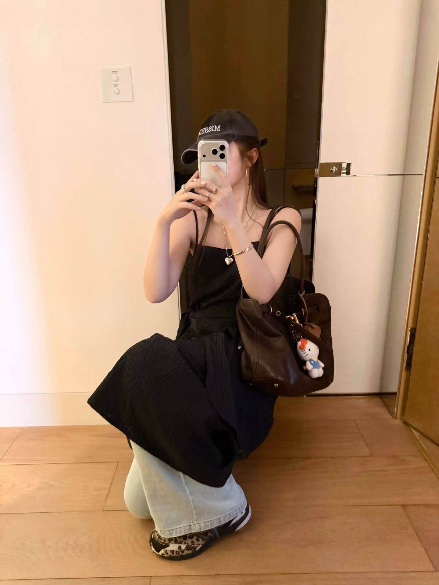 现货ARTE韩系简约气质百搭宽松显瘦纹理格纹吊带裙搭配宽松衬衫