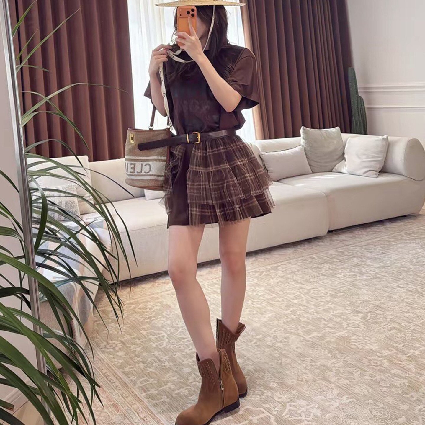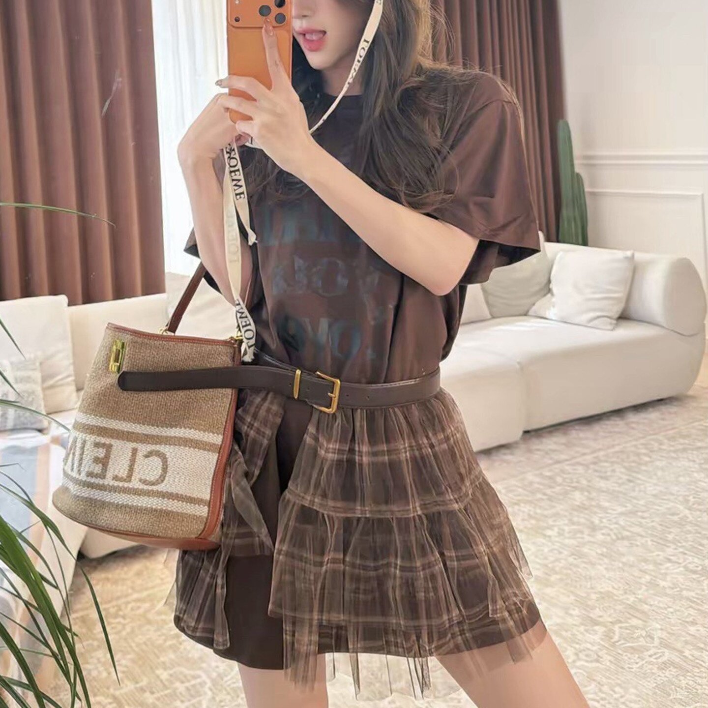 大码 复古字母印花慵懒休闲宽松上衣高腰百搭条纹半身裙女 胖MM美式