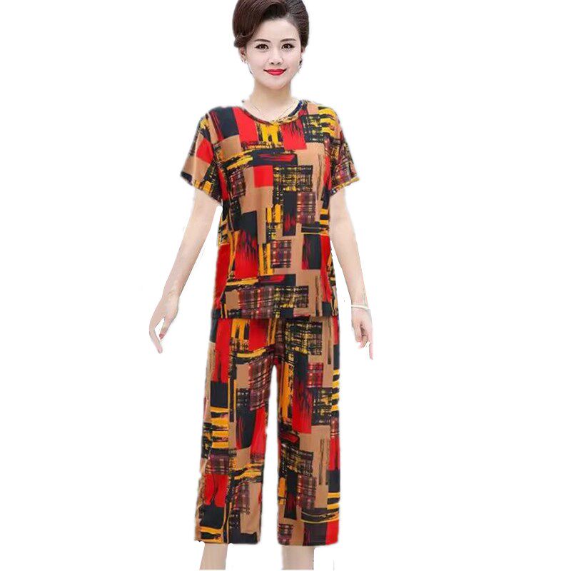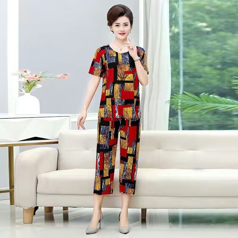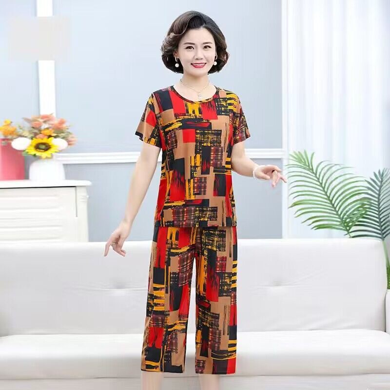 休闲短袖 中老年女装 冰丝妈妈夏装 衣服两件套 套装 女薄款 七分裤 大码