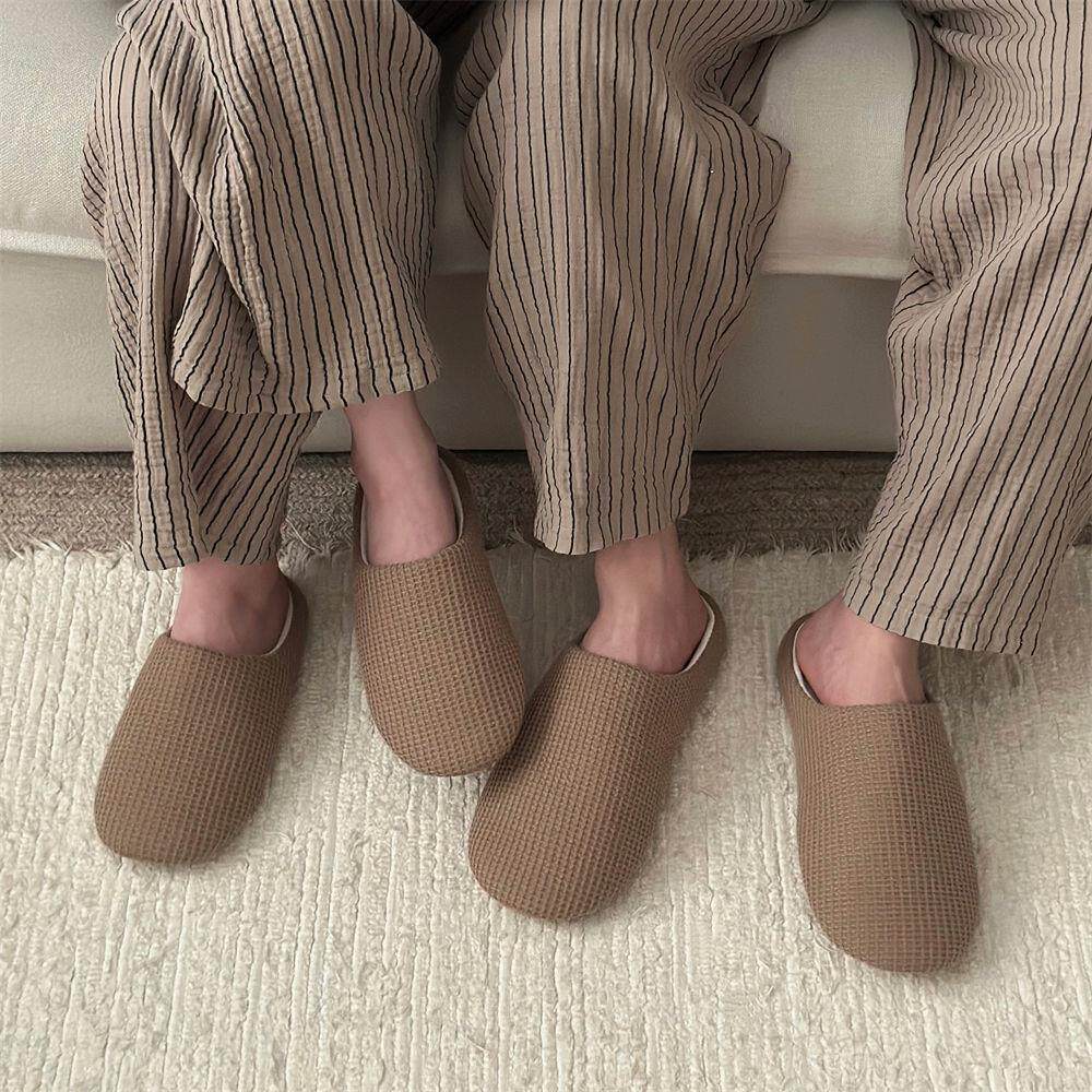 日系静音情侣舒适地板鞋 男女华夫格室内吸汗透气春夏ins棉布拖鞋