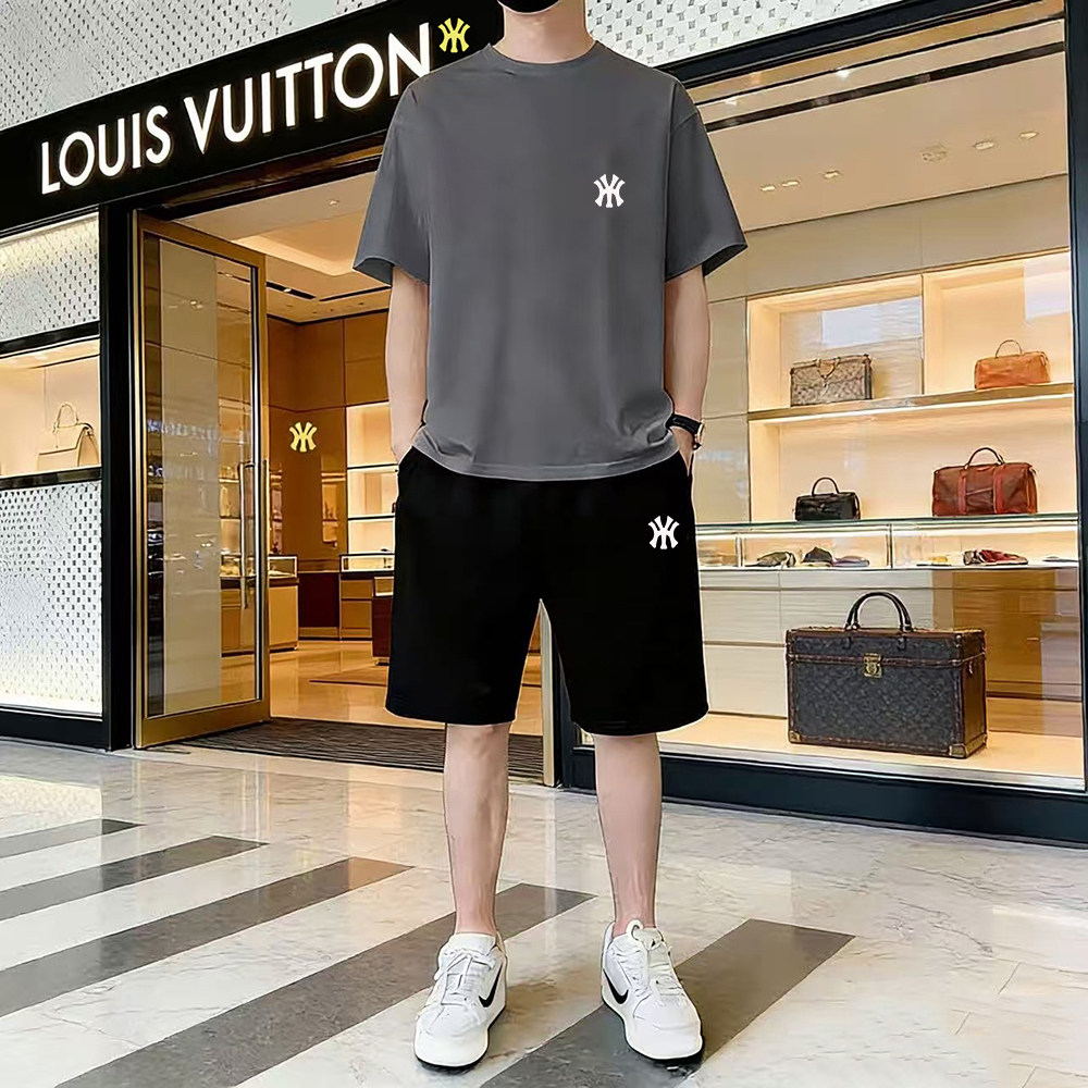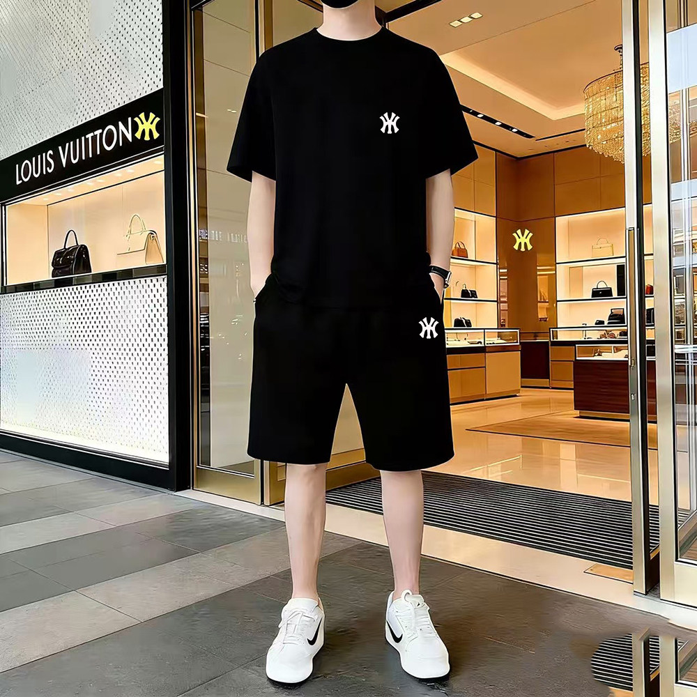 短袖 高端纯棉休闲套装 男夏季 圆领宽松潮牌印花运动大码 两件套 短裤