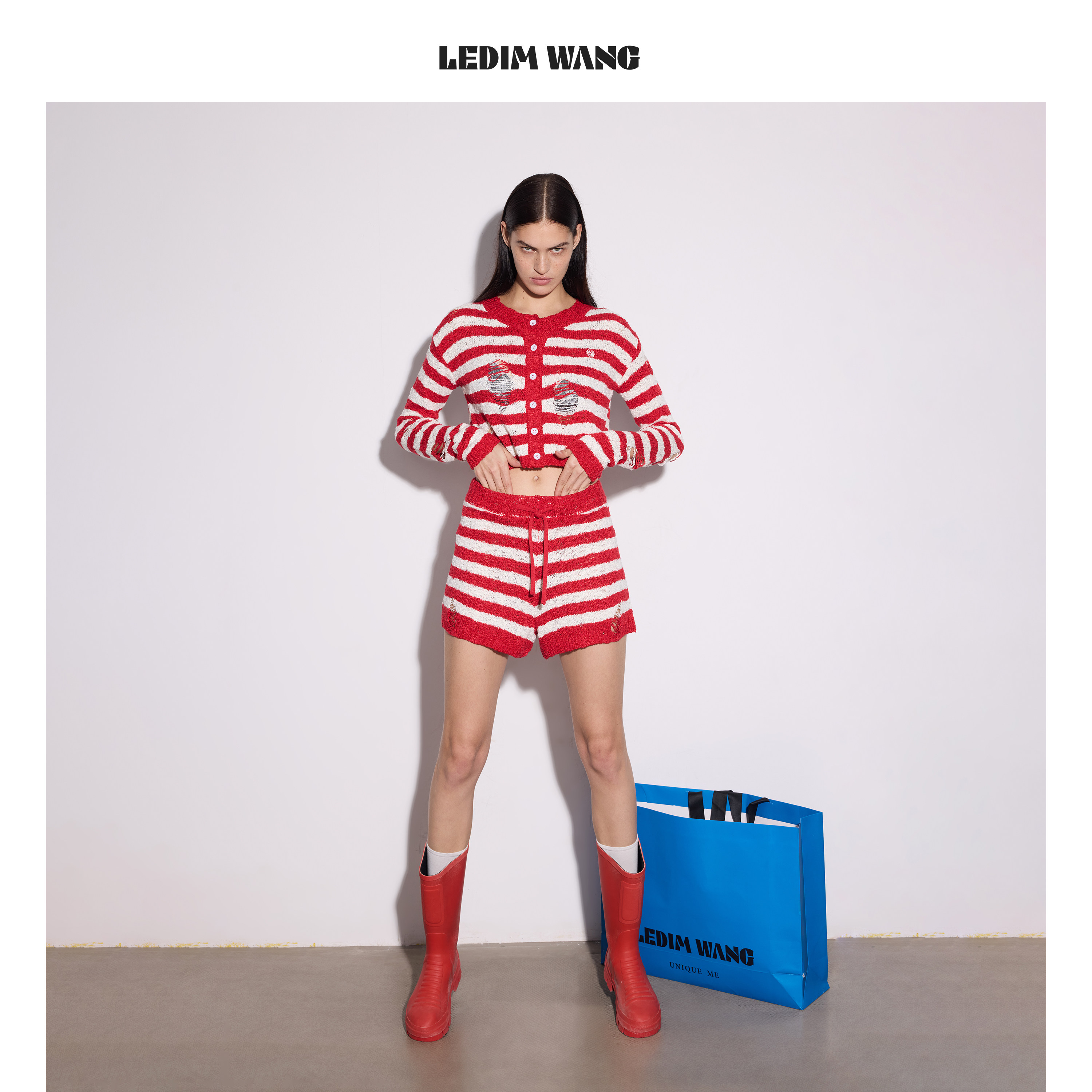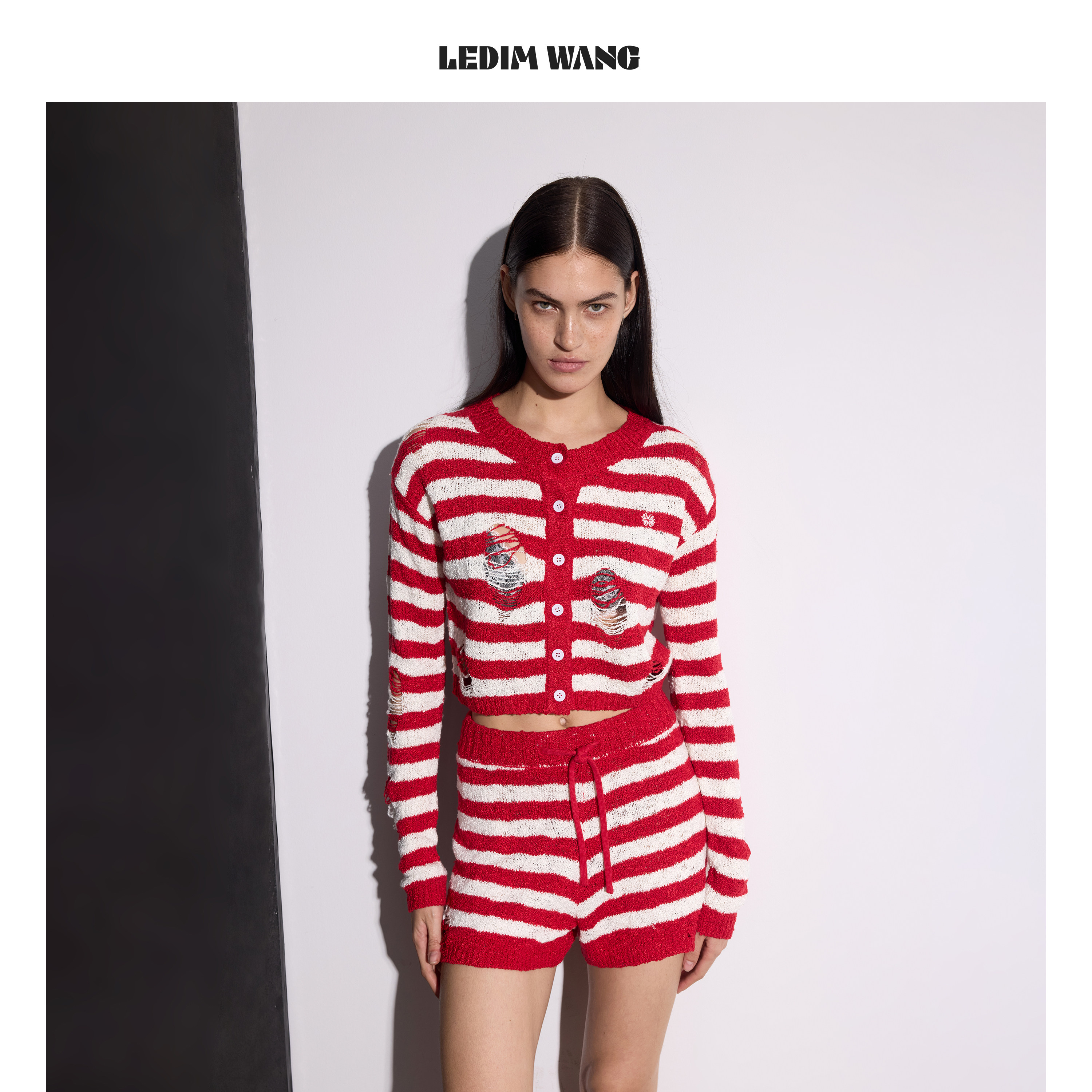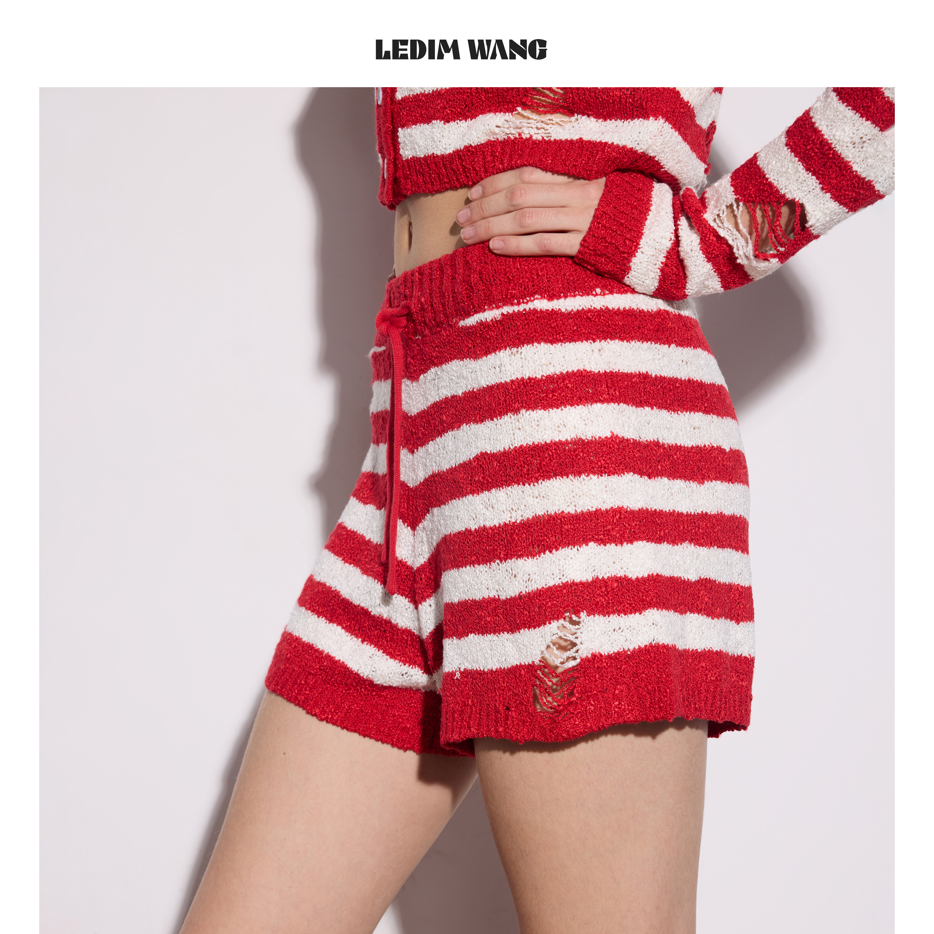 为您提供商品LEDIM 女红白撞色直筒休闲裤 26春夏新款 WANG破洞流苏条纹针织短裤的详细介绍,