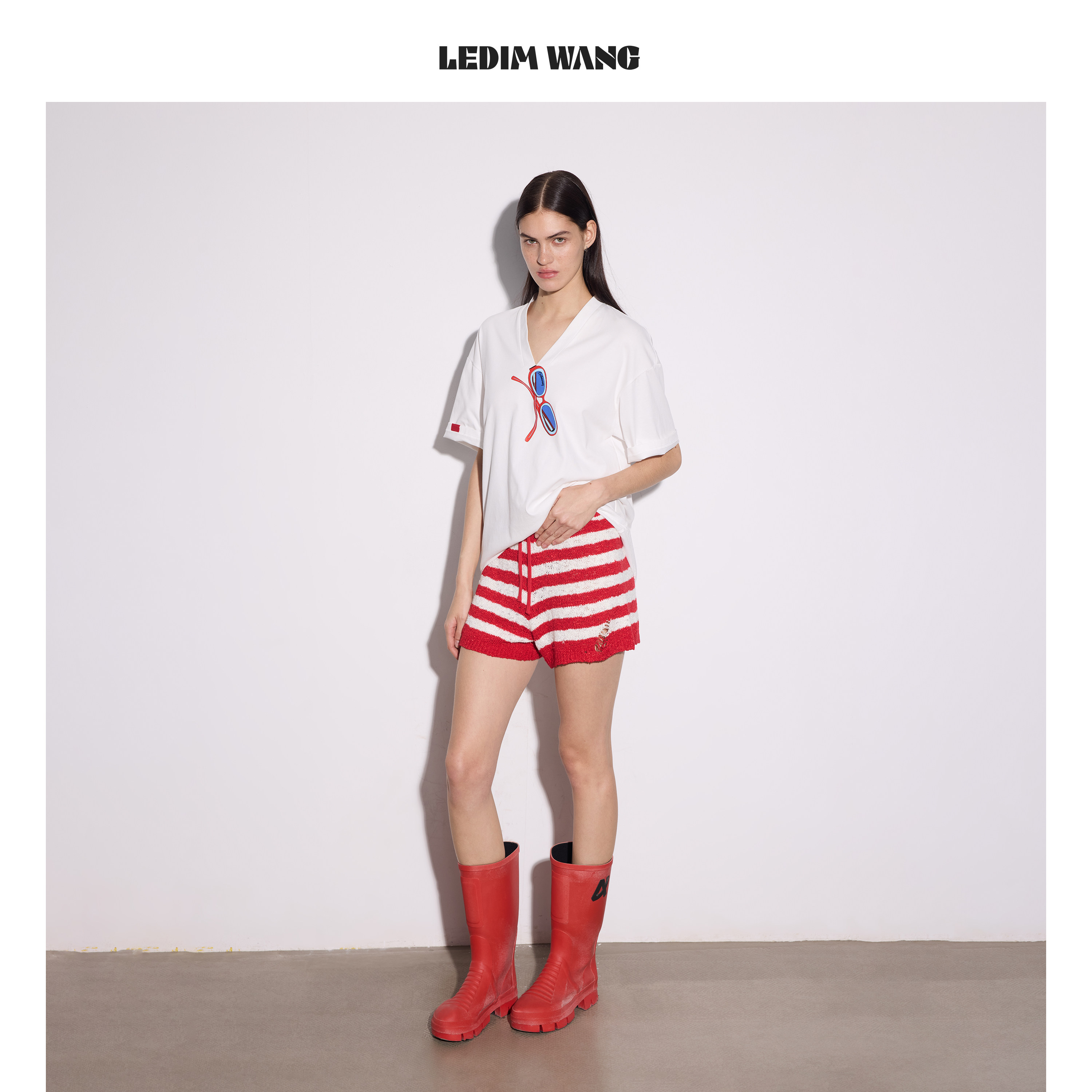 LEDIM 女红白撞色直筒休闲裤 26春夏新款 WANG破洞流苏条纹针织短裤由