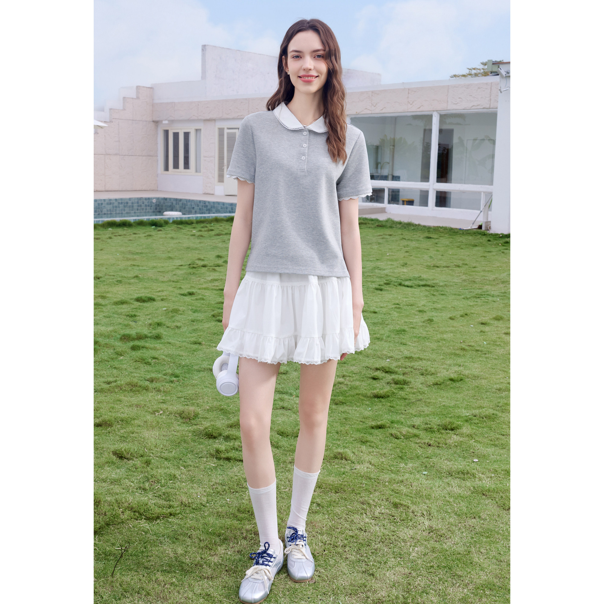 betu百图花边polo领T恤女短袖 新款 宽松显瘦灰色小衫 2026年夏季由