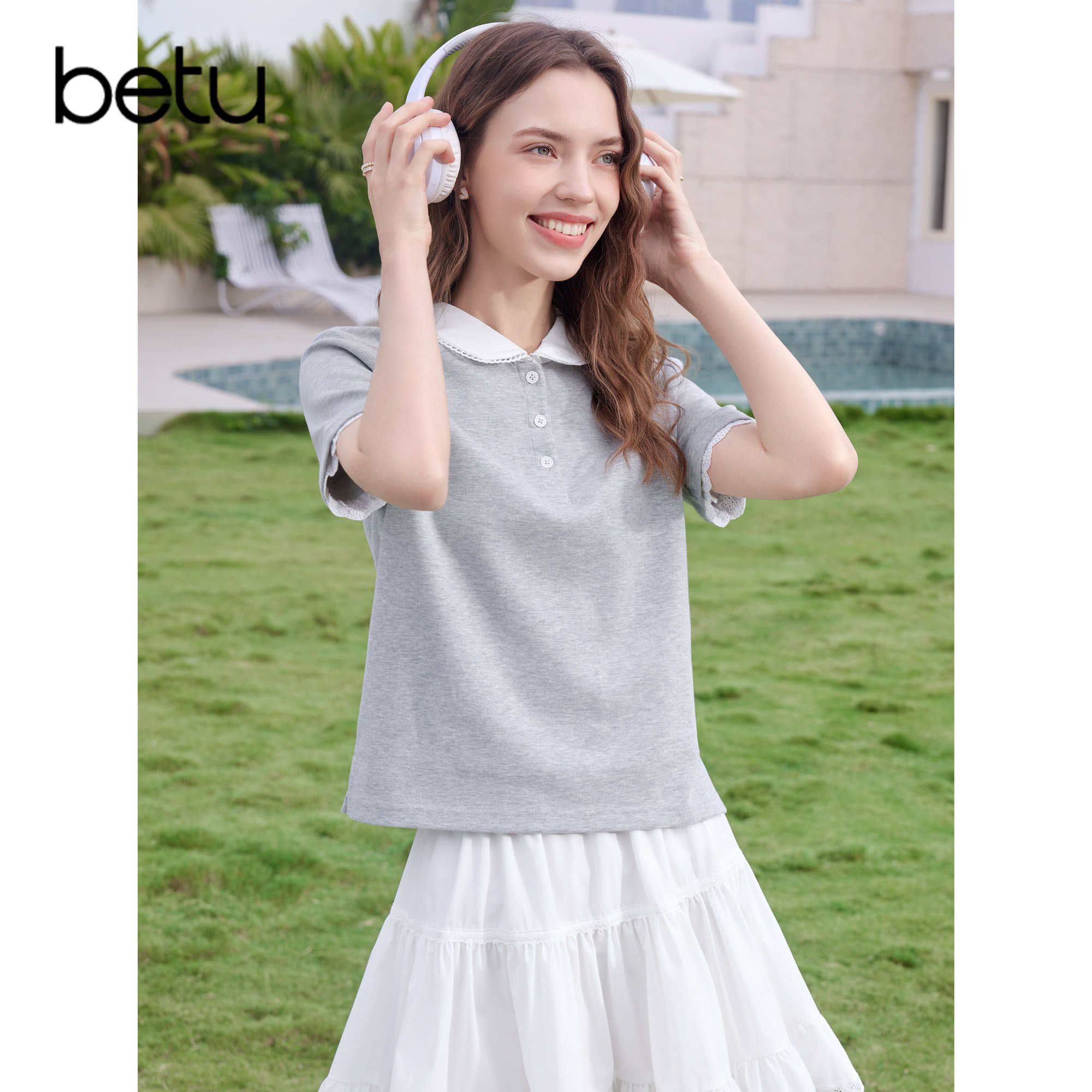 betu百图花边polo领T恤女短袖 新款 宽松显瘦灰色小衫 2026年夏季