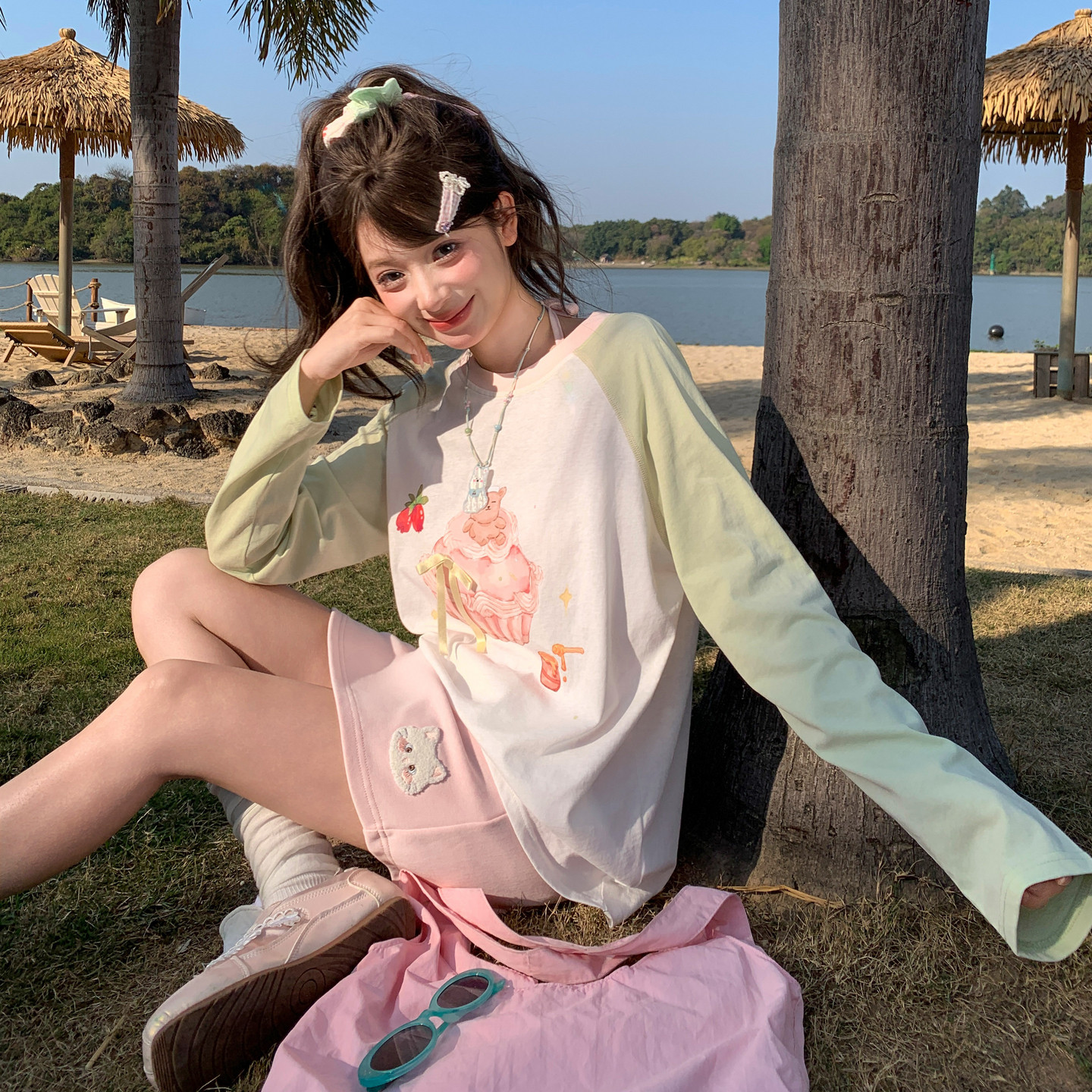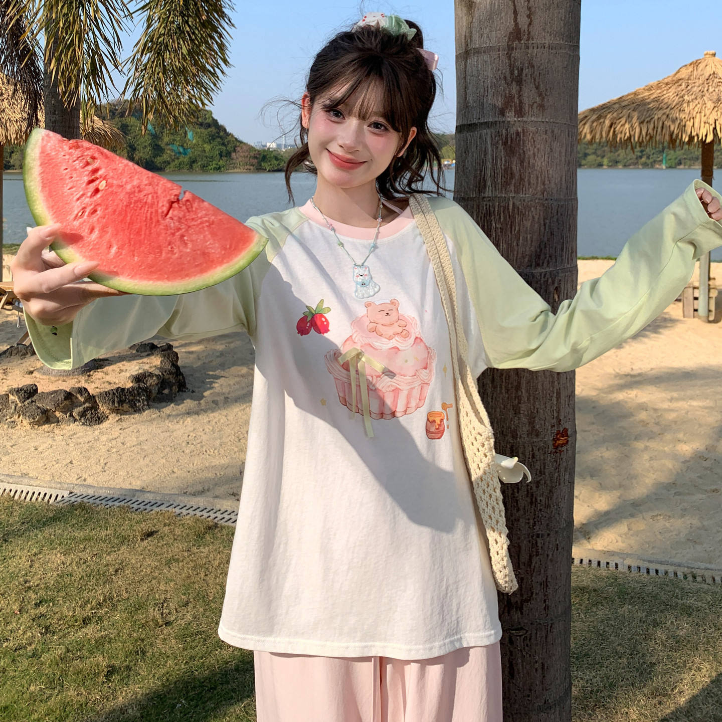 t恤女2026新款 圆领上衣 气少女感小熊印花长袖 森女部落甜美撞色元