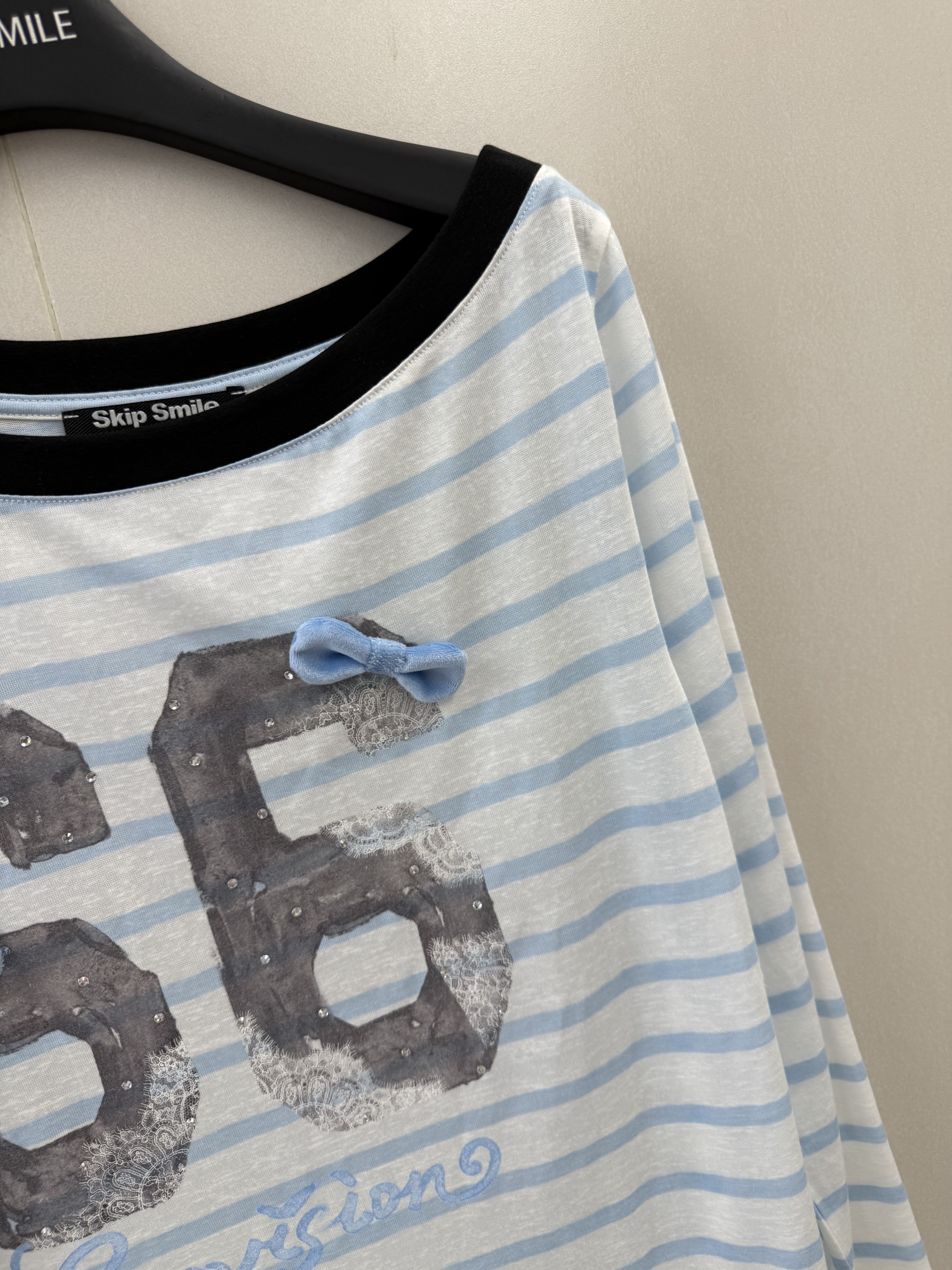 Smile甜酷穿搭立体蝴蝶结66好印花条纹斜肩T恤辣妹休闲上衣T Skip