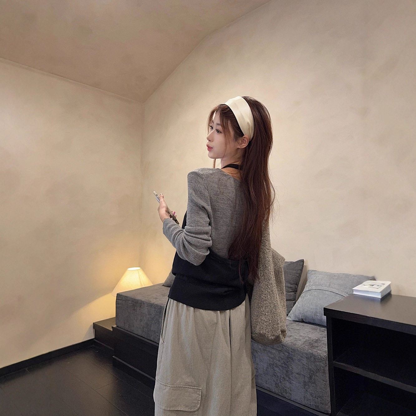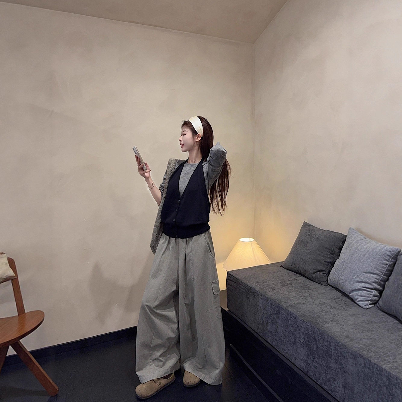 休闲裤 韩系复古春秋休闲套装 女灰色针织衫 挂脖吊带工装 一整套 时尚由