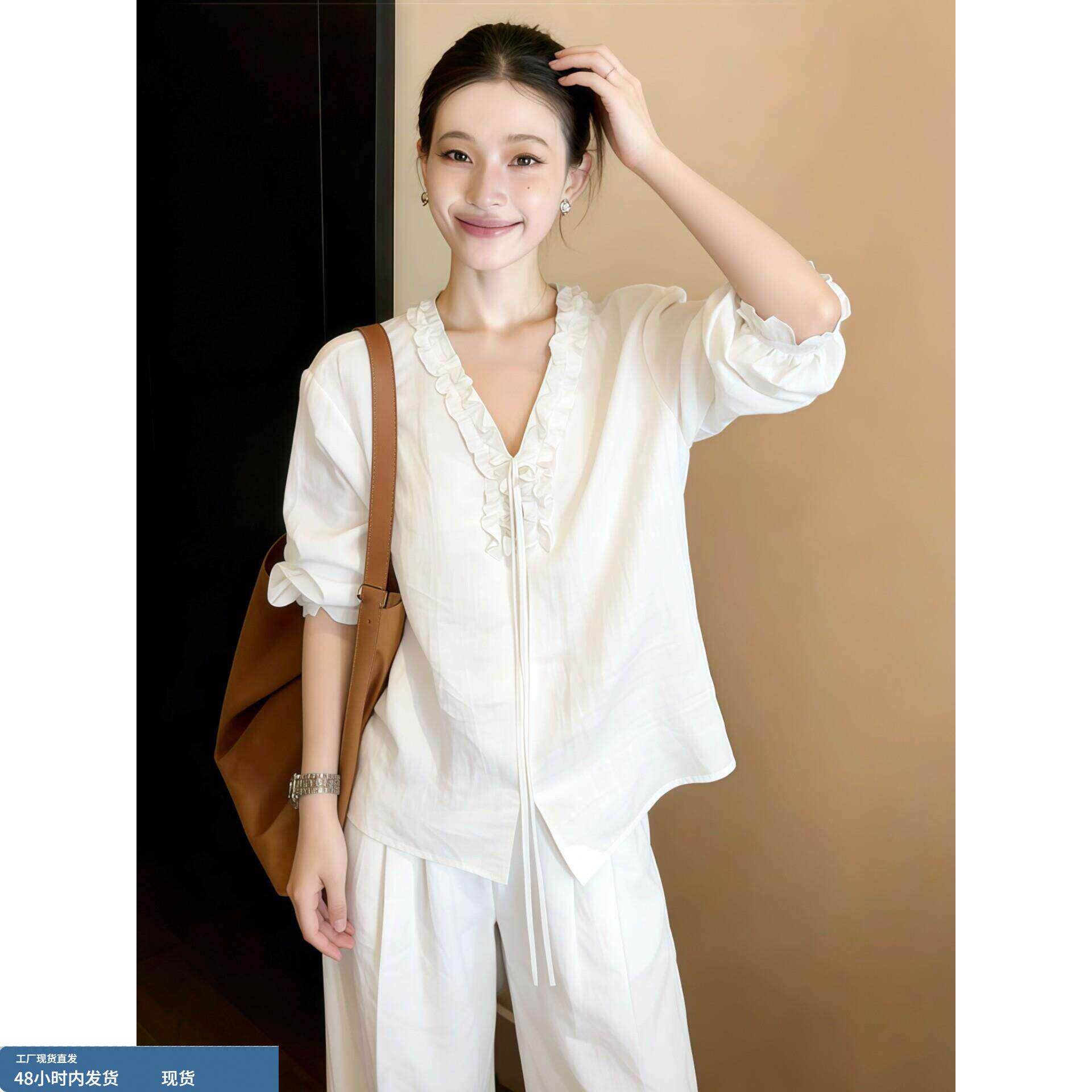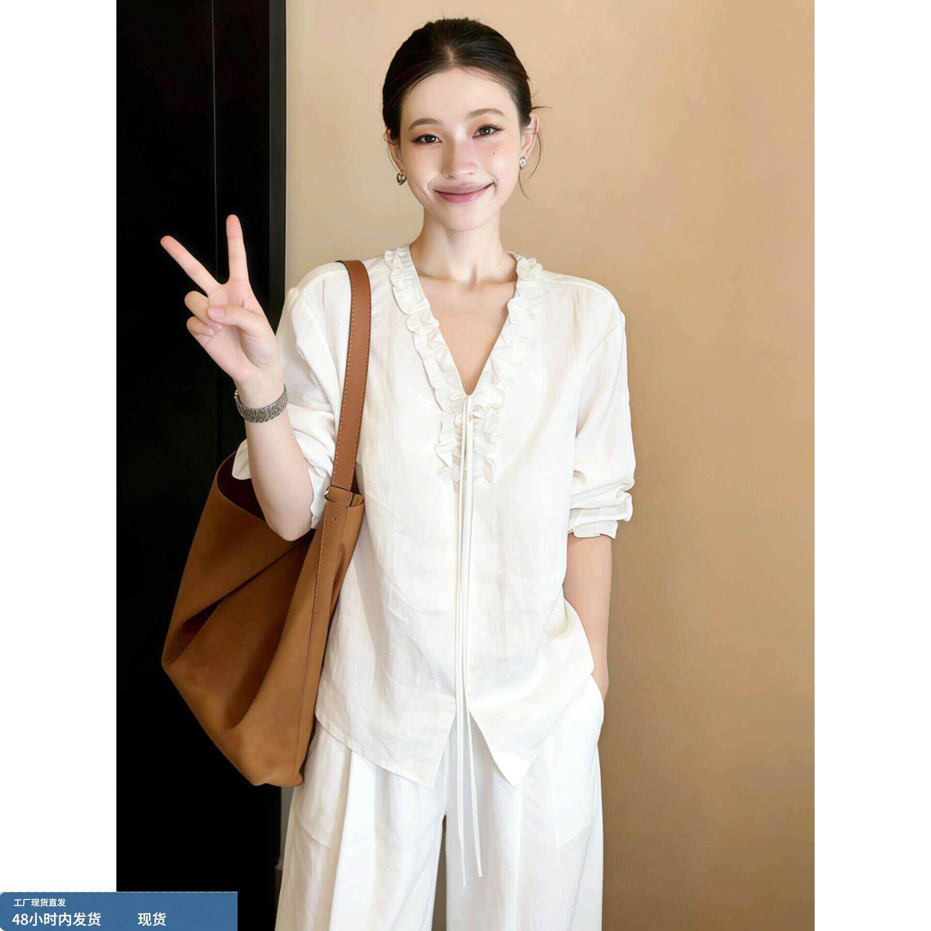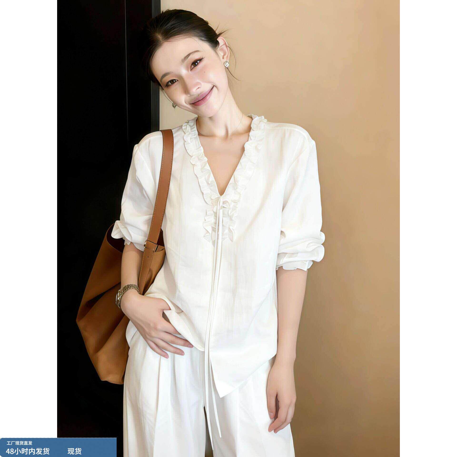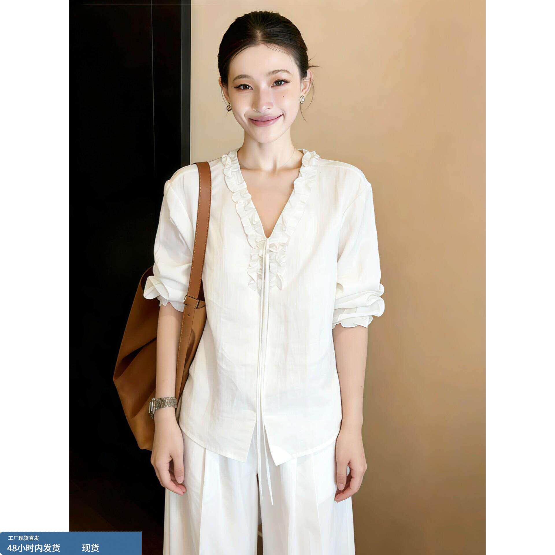 女士春季 法式 高级感白色v领木耳边长袖 衬衫 独特漂亮欧货上衣 大码由