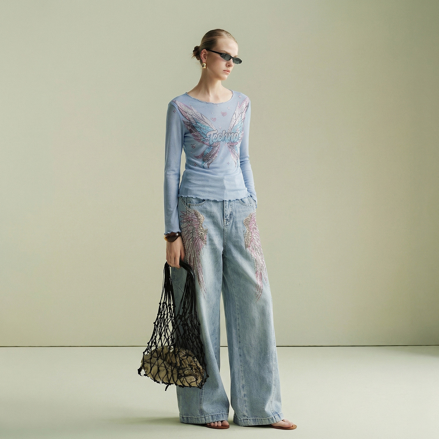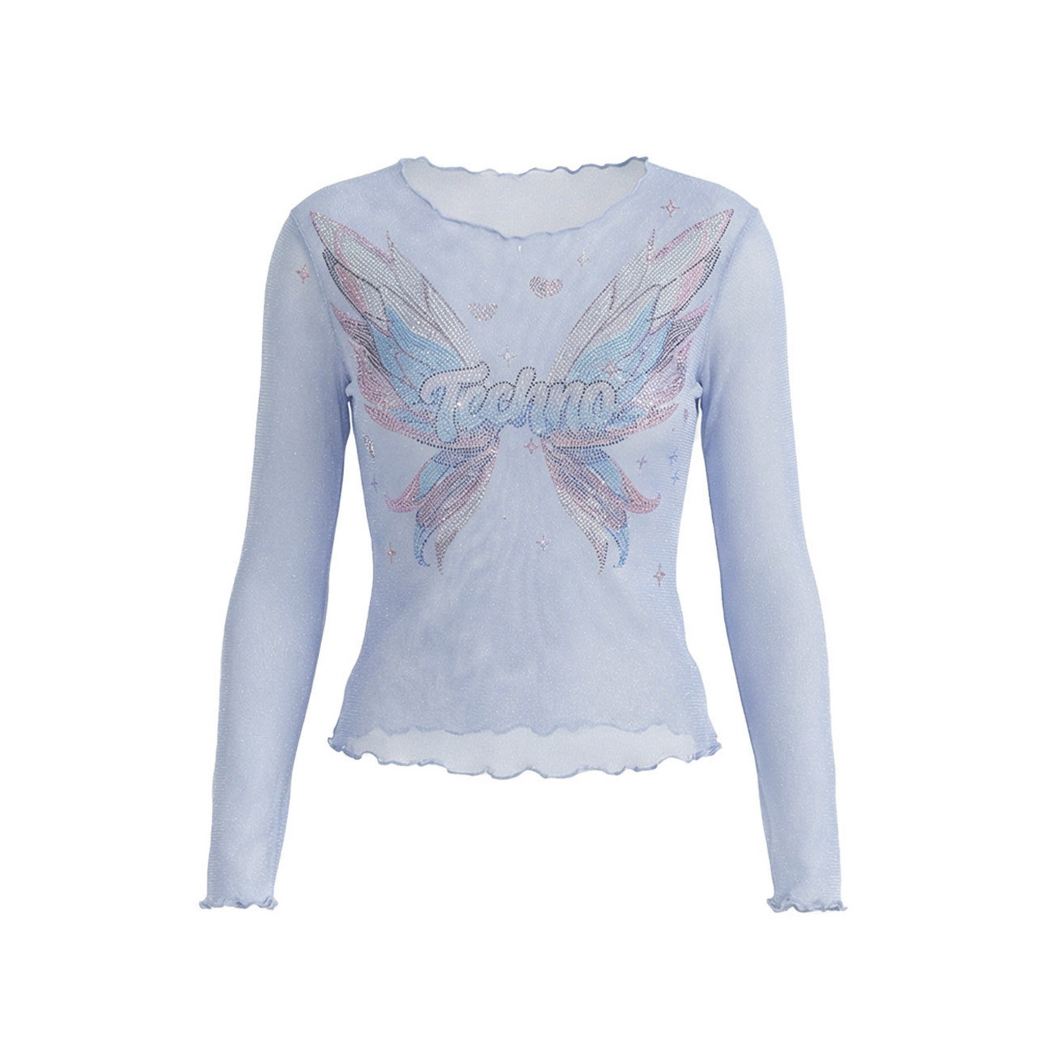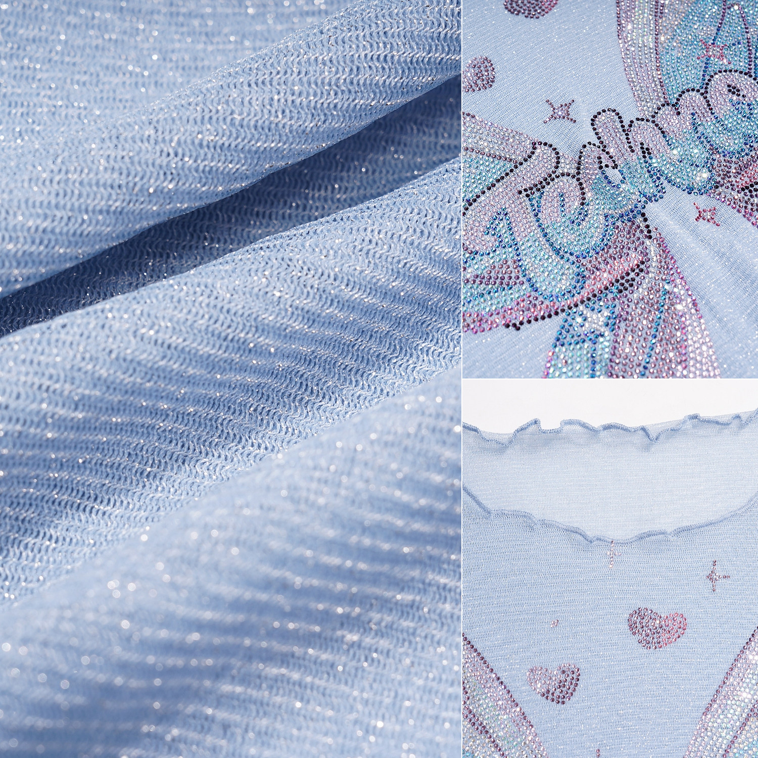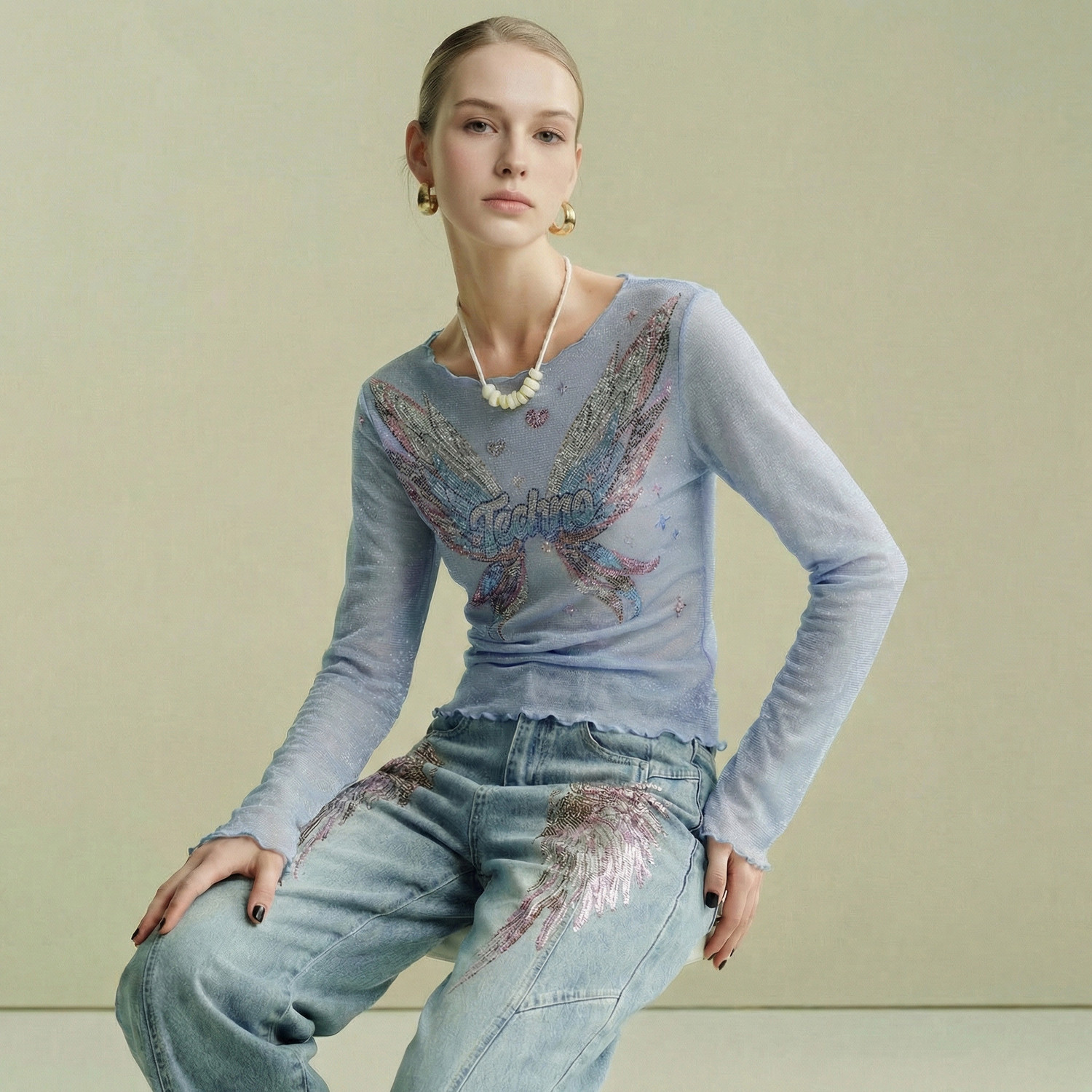 TCH千禧风渐烫钻羽翼打底衫 上衣T78A02E1042 女木耳边显瘦内搭长袖