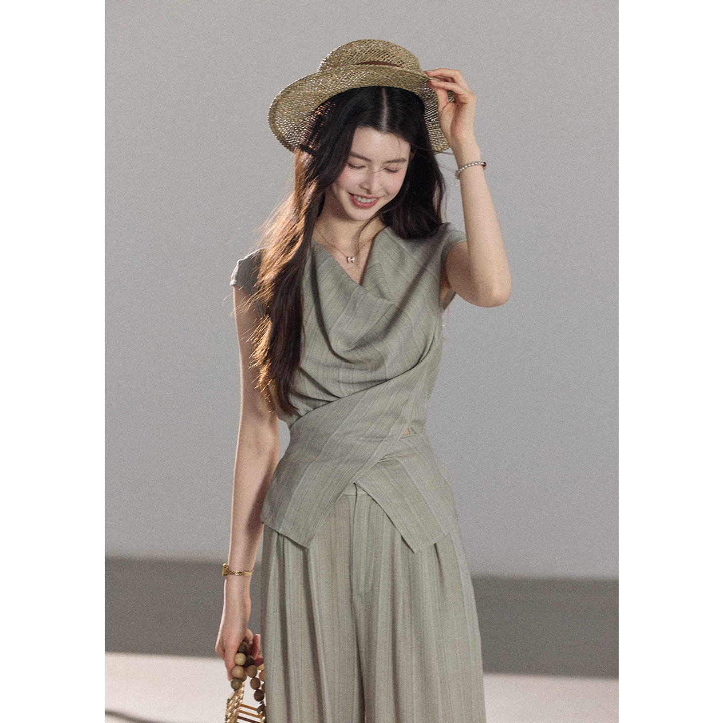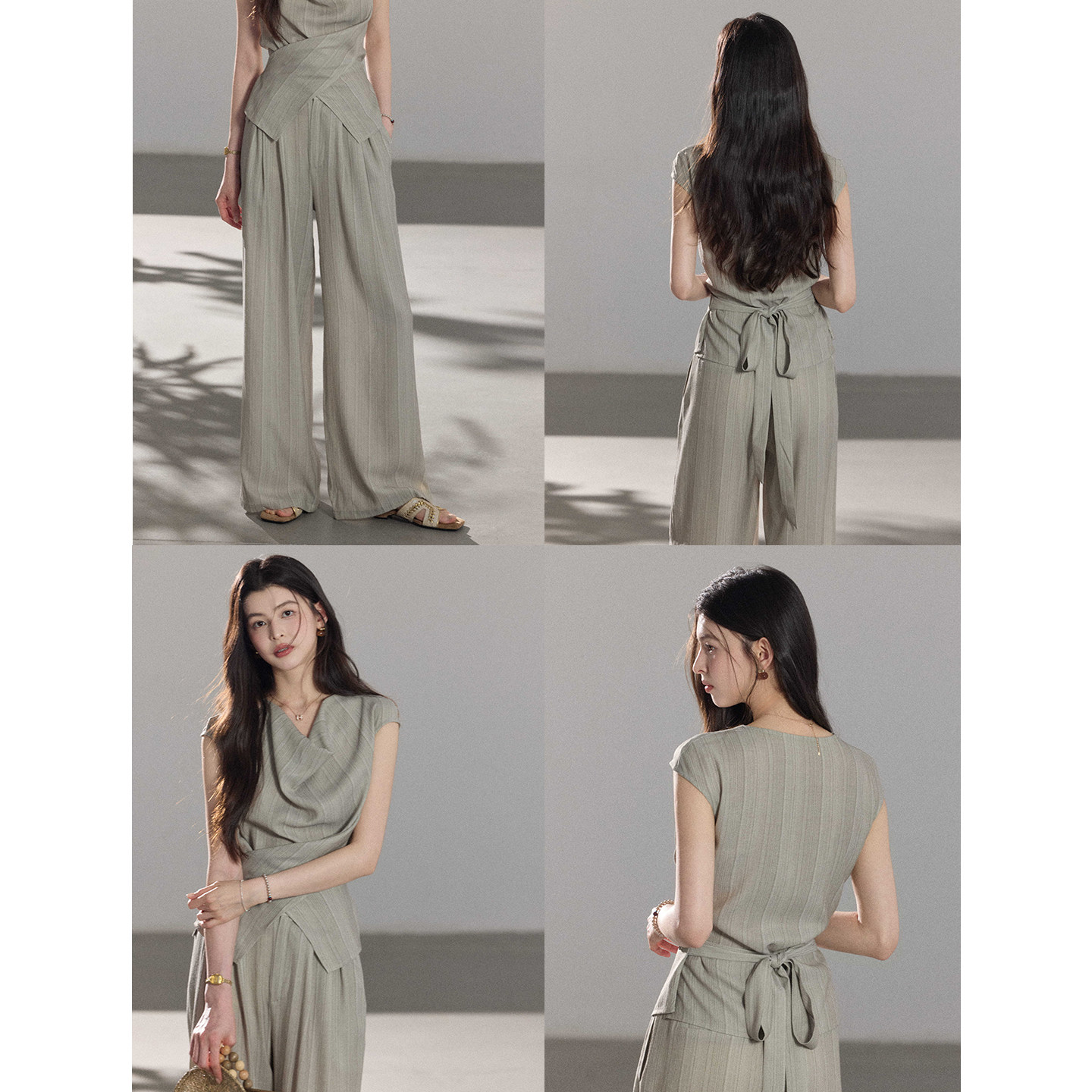 休闲通勤套装 贰羊设计 阔腿裤 上衣 镜水生 老钱风荡领收腰无袖