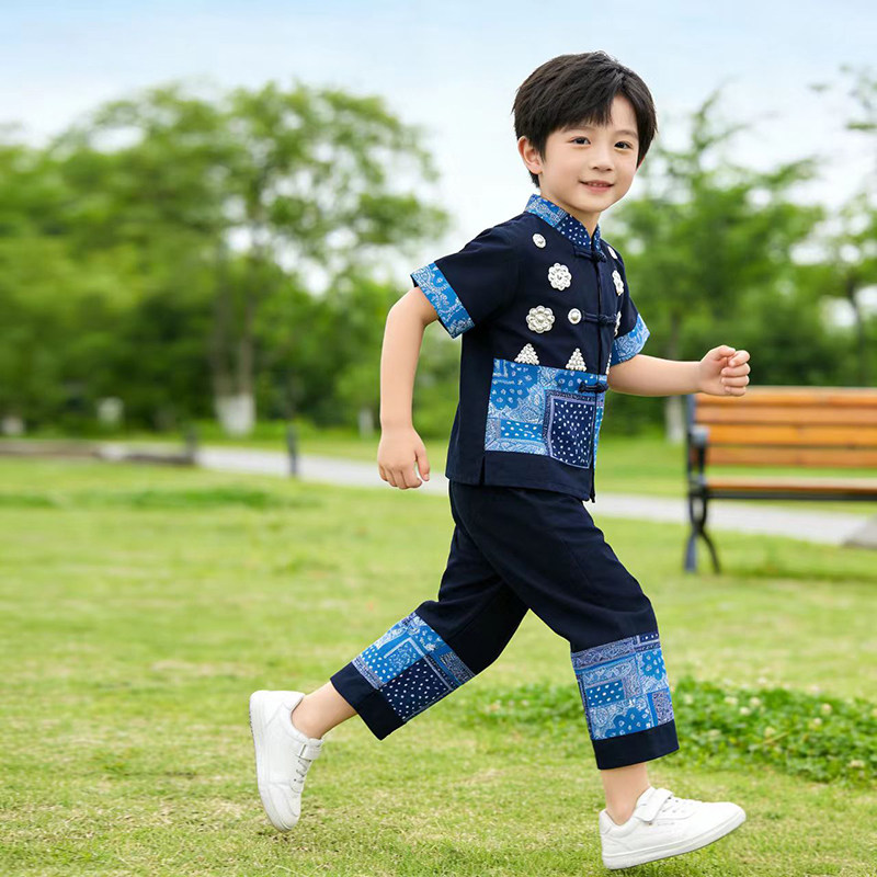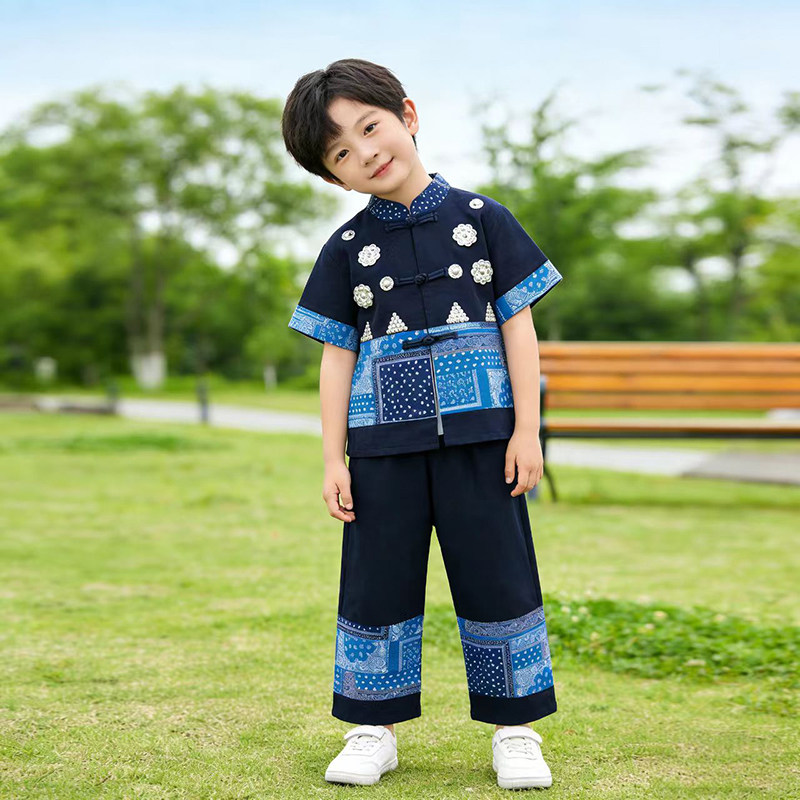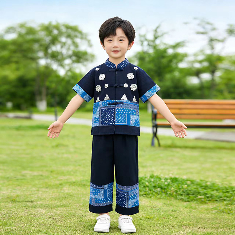 男童少数民族风汉服套装 儿童傣族苗族壮族服三月三舞蹈表演服 短袖