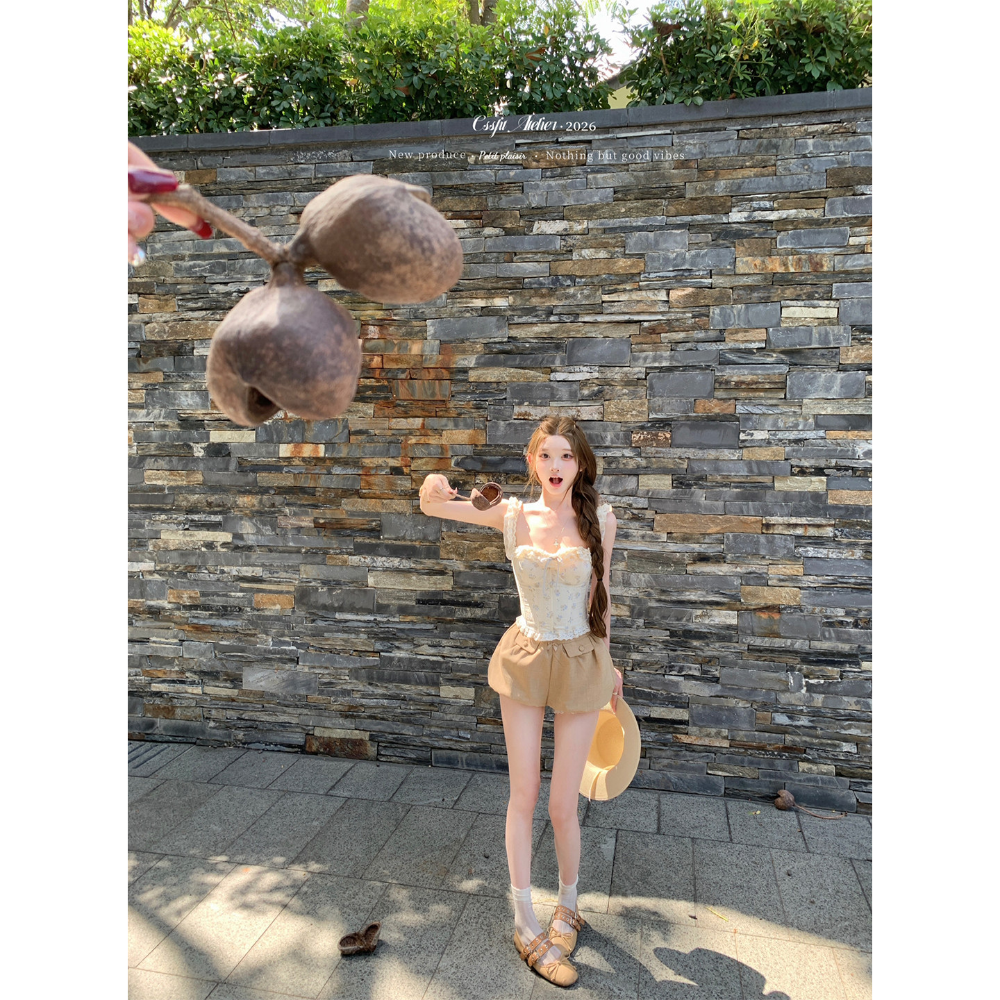 迟伞伞26 明媚橘光 小黄花撞色刺绣花边系带上衣短裙甜美套装