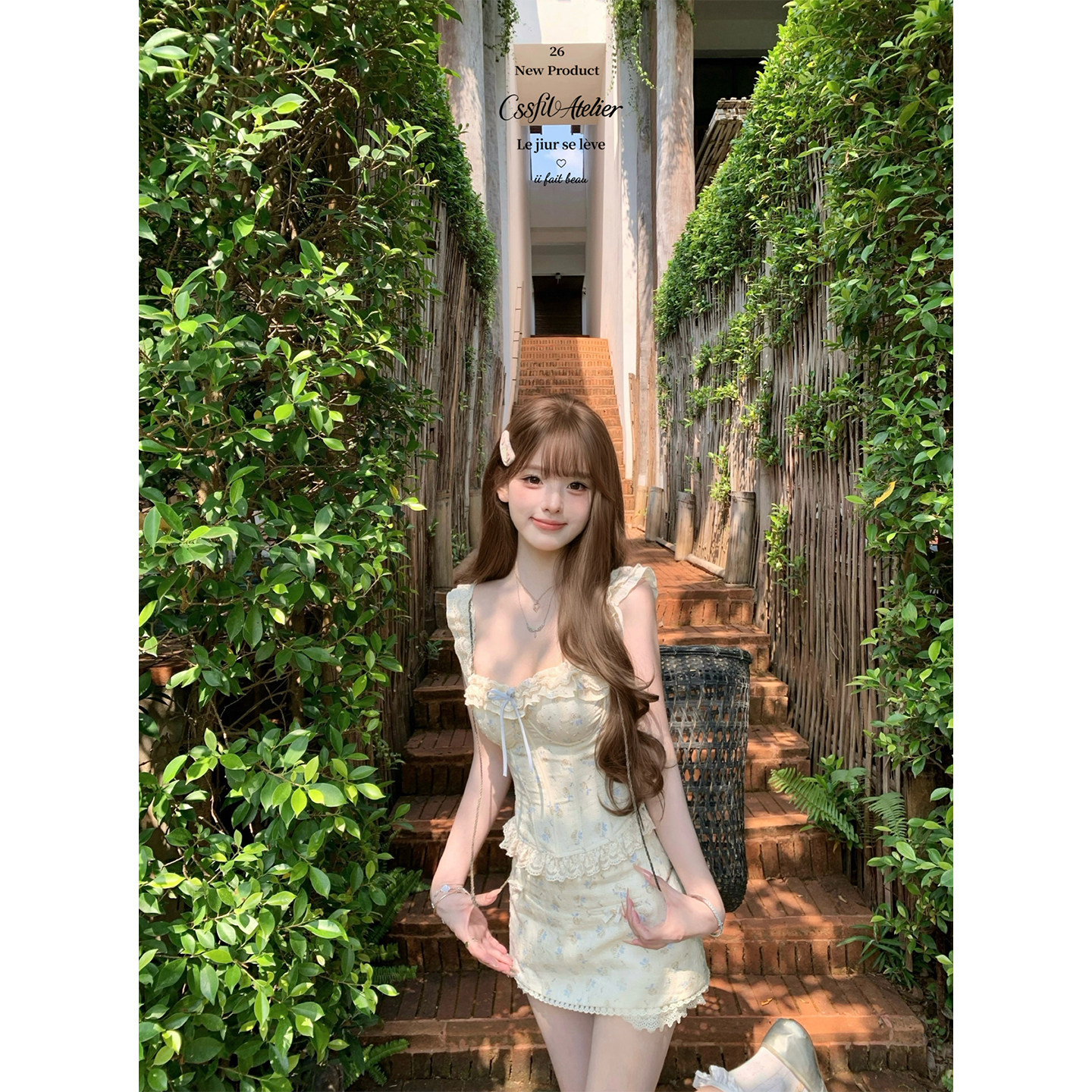 秋水伊人气质方领碎花连衣裙女挂脖时尚 套装 裙 李佳琦直播间