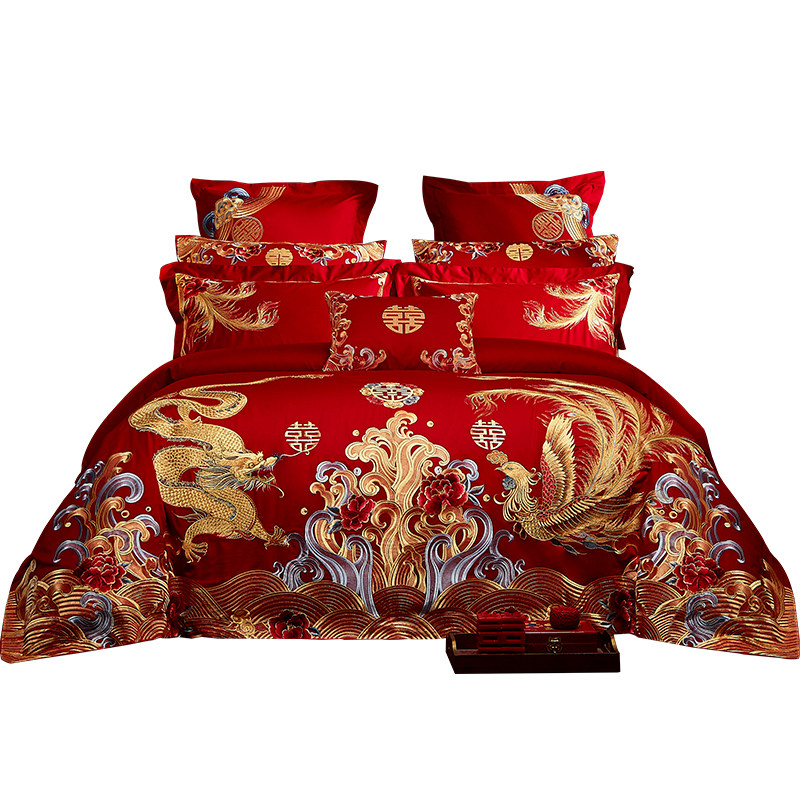 为您提供商品婚庆四件套大红全棉100支长绒棉刺绣龙凤结O婚房嫁喜庆被床上用品的详细介绍,