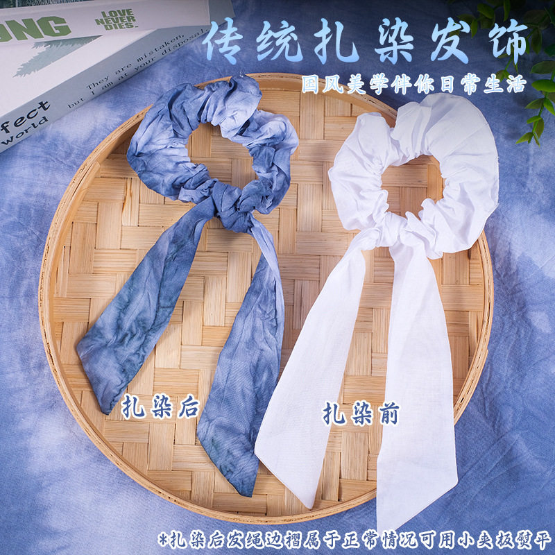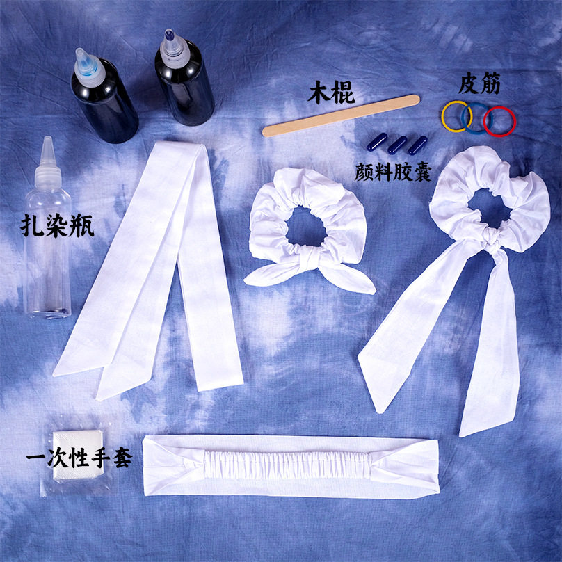 手工DIY扎染发圈材料包生日礼物头饰品飘带纯棉白色大肠发圈蓝染