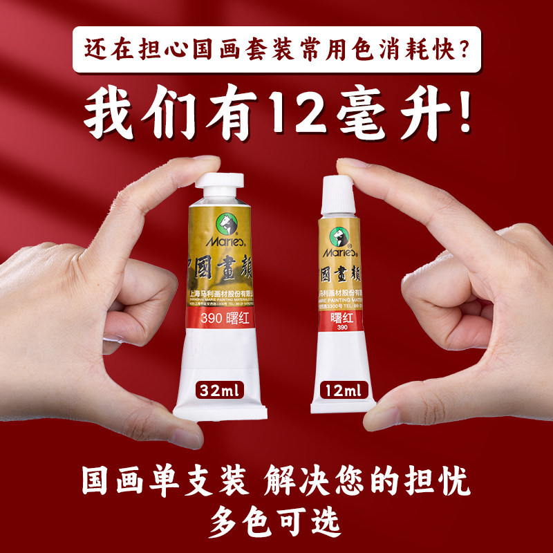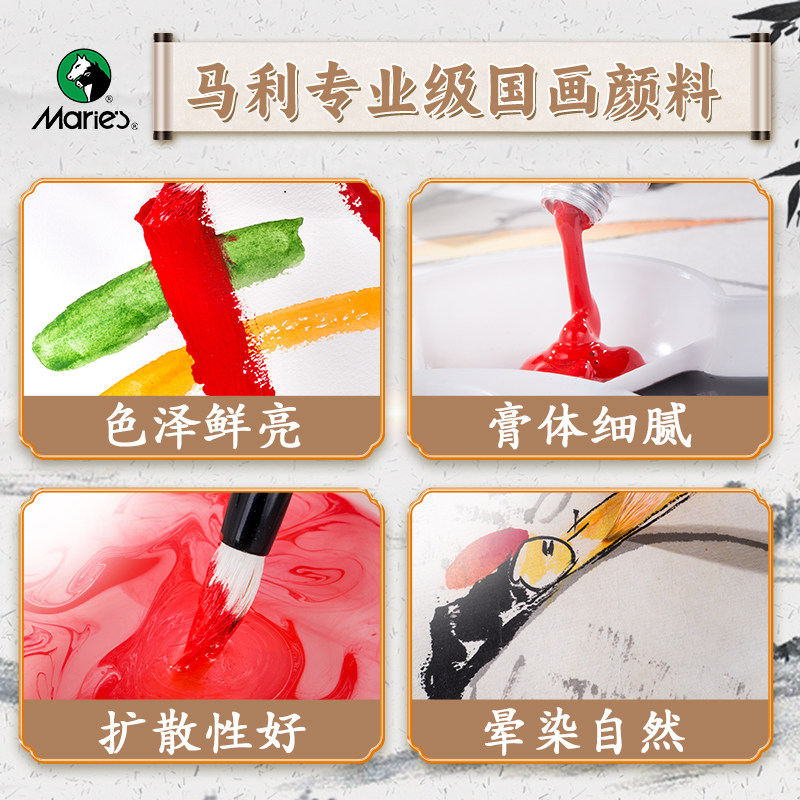 马利牌国画颜料初学者专用12ml单支中国画工笔画工具32ml大容量水墨画玛丽钛白藤黄白色花青金色单色专业染料