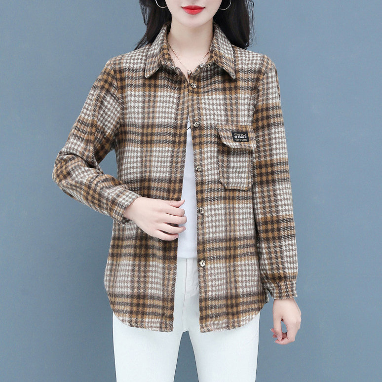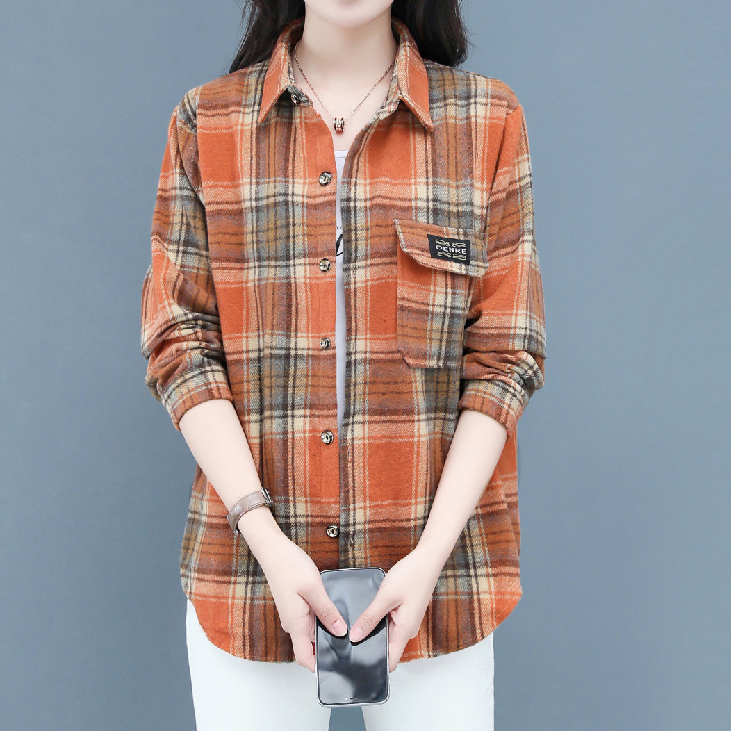 格子衬衫 休闲百搭磨毛呢加厚外套宽松中年棉质衬衣女 长袖 春秋女装由