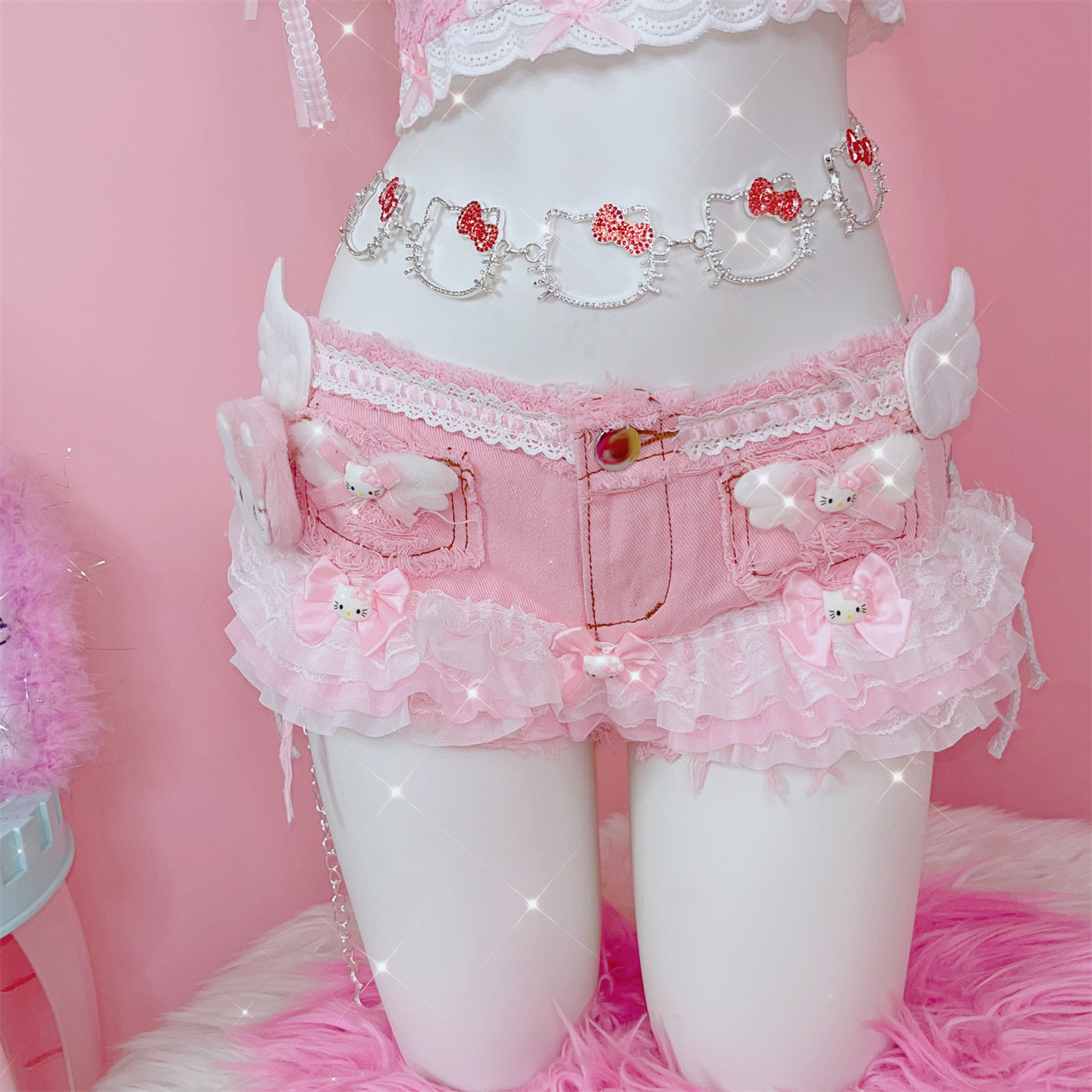 野涩猫 Y2K辣妹日系可爱甜美少女小猫蕾丝洛丽塔翅膀蕾丝粉色短裤