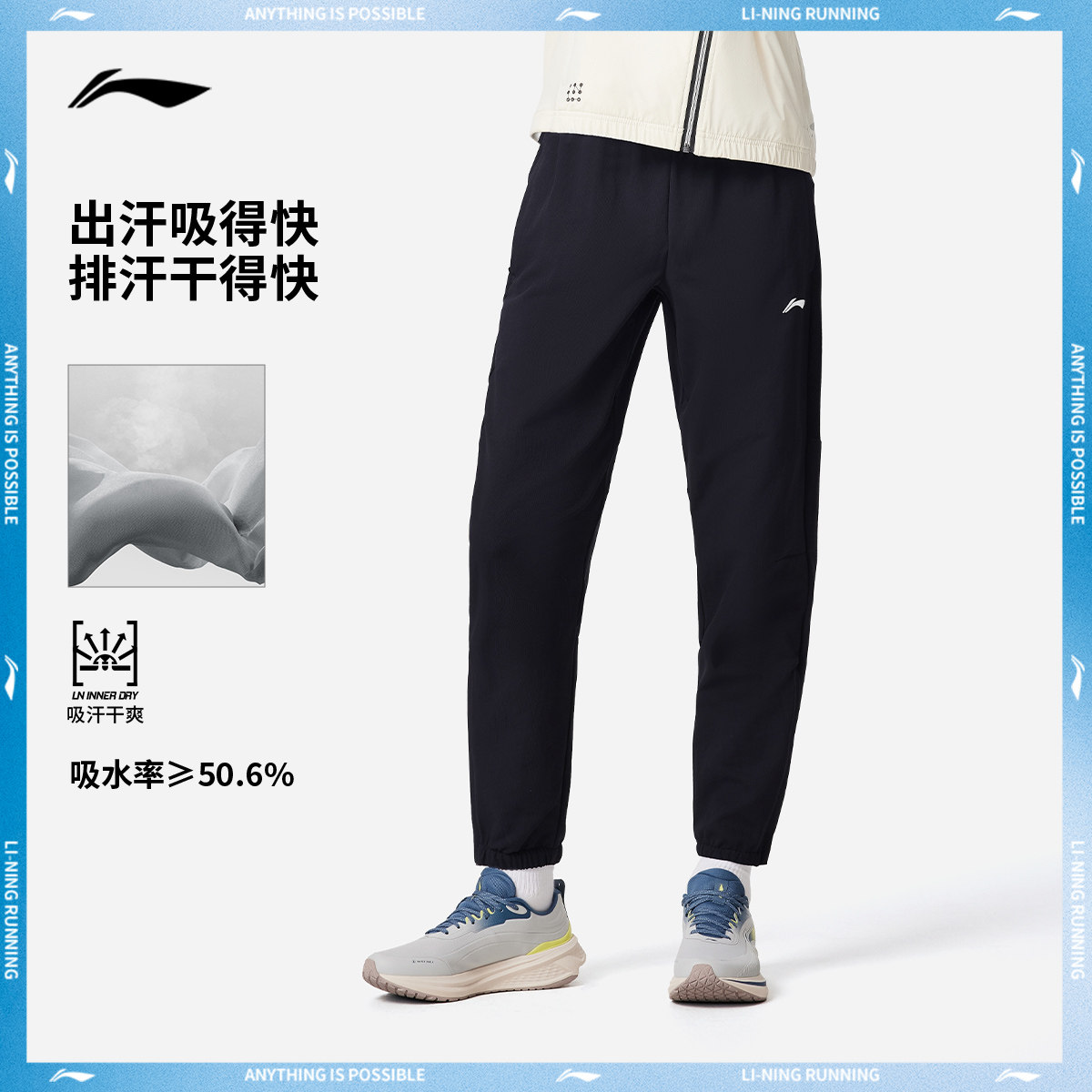 反光束脚梭织运动裤 李宁运动长裤 子春季 跑步弹力裤 男士 黑色新款