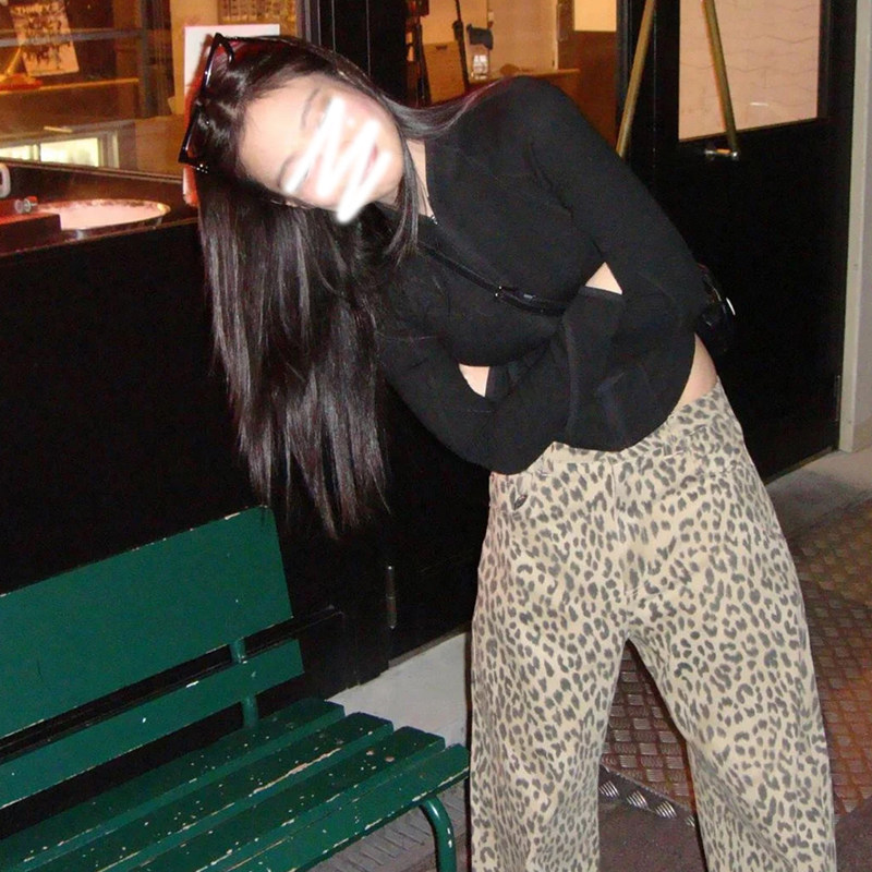 女春秋新款 Jennie金智妮同款 美式 辣妹豹纹阔腿牛仔裤 子 直筒拖地裤