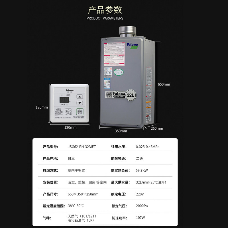 为您提供商品Paloma 323IET日本进口平衡式 燃气热水器炫光32升 百乐满JSG62的详细介绍,