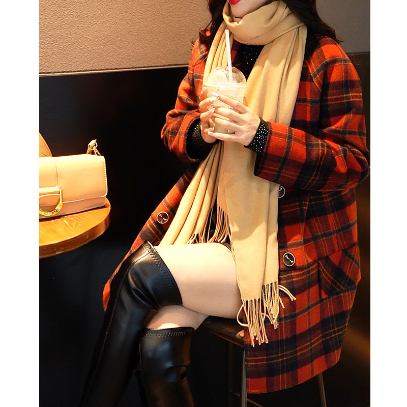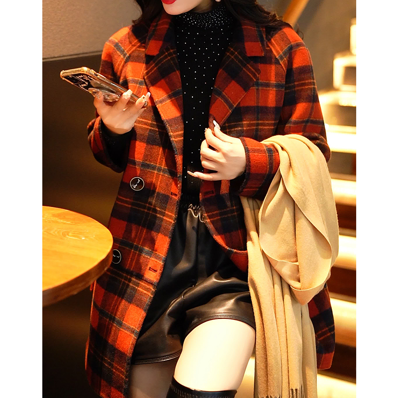 新款 2023年 气质小个子羊毛呢格子外套秋冬季 红色双面呢大衣女韩版