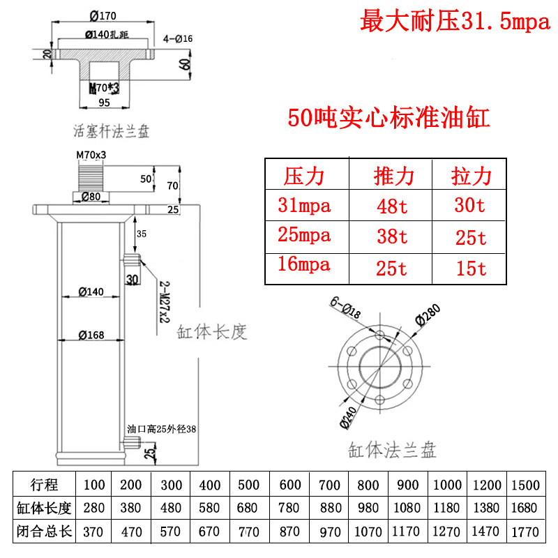 液压油缸50吨60t实心双向法兰液压缸大全手动电动压力打包机油顶由