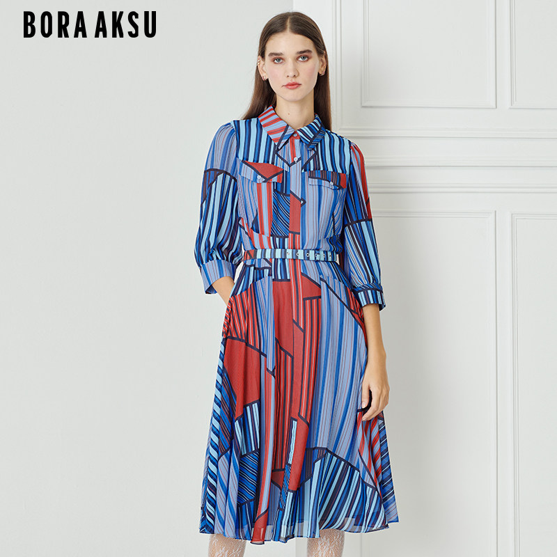 BORAAKSU2023早春新款 红蓝条纹印花衬衫 式 连衣裙B1DAW61050 泡泡袖