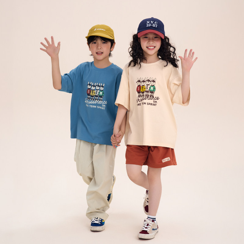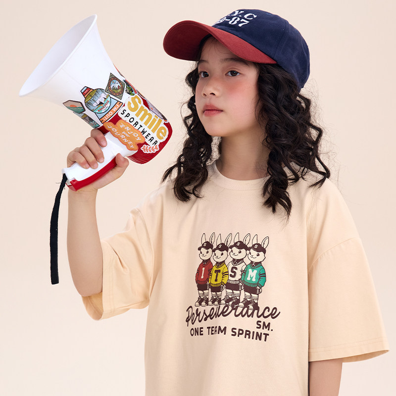 日系儿童复古兔子印花T恤男童女童宽松圆领短袖 上衣 smile Its